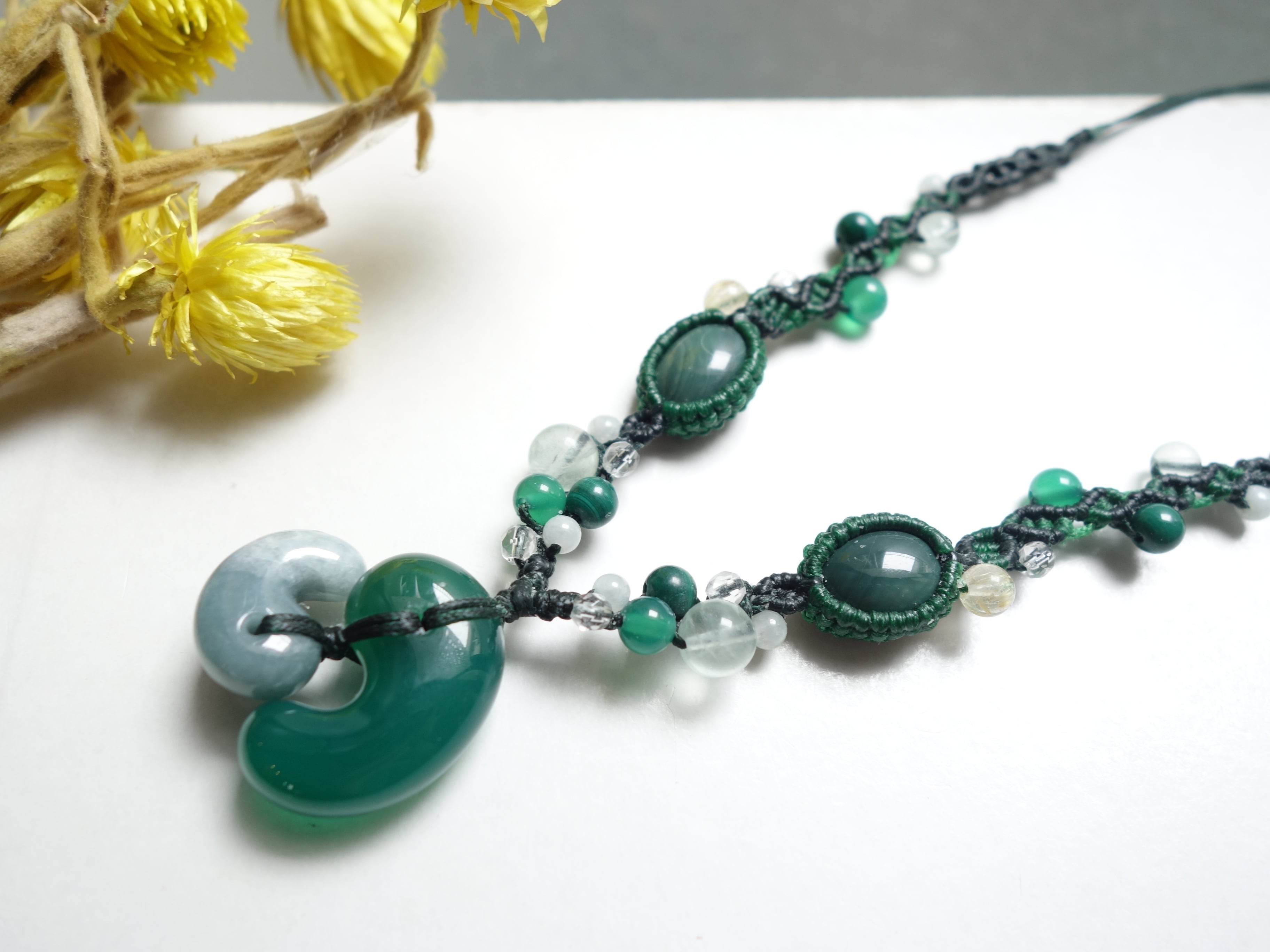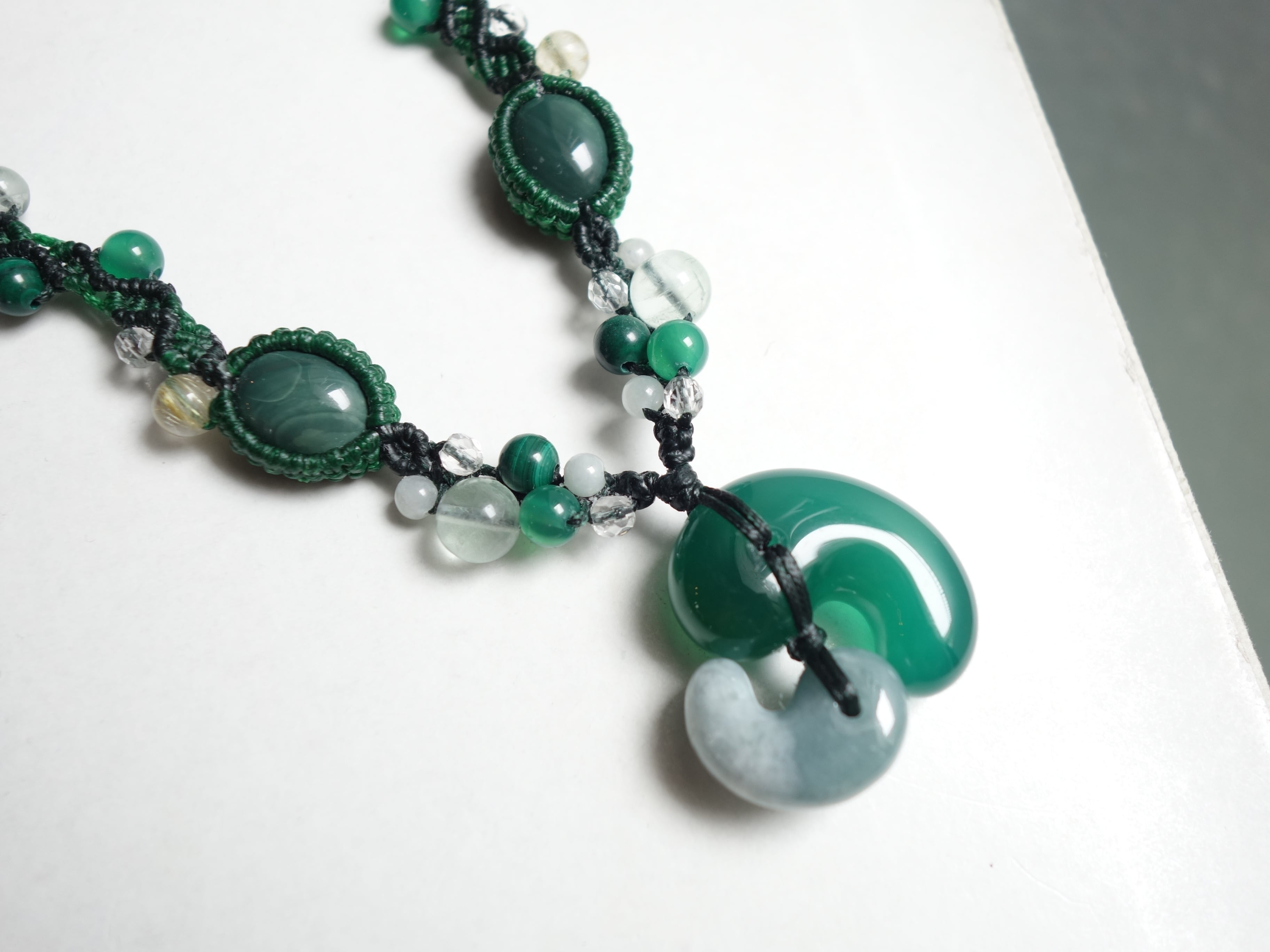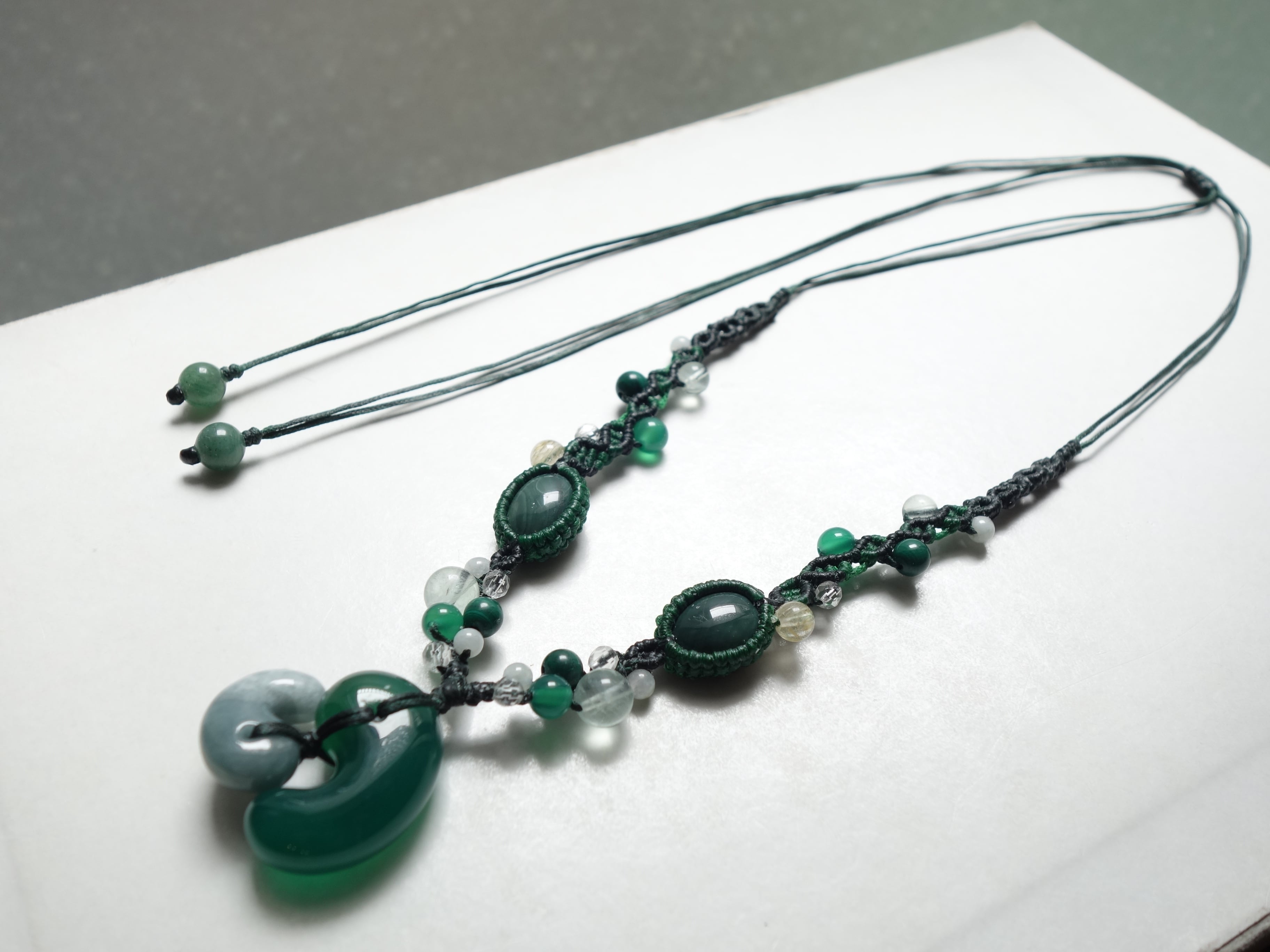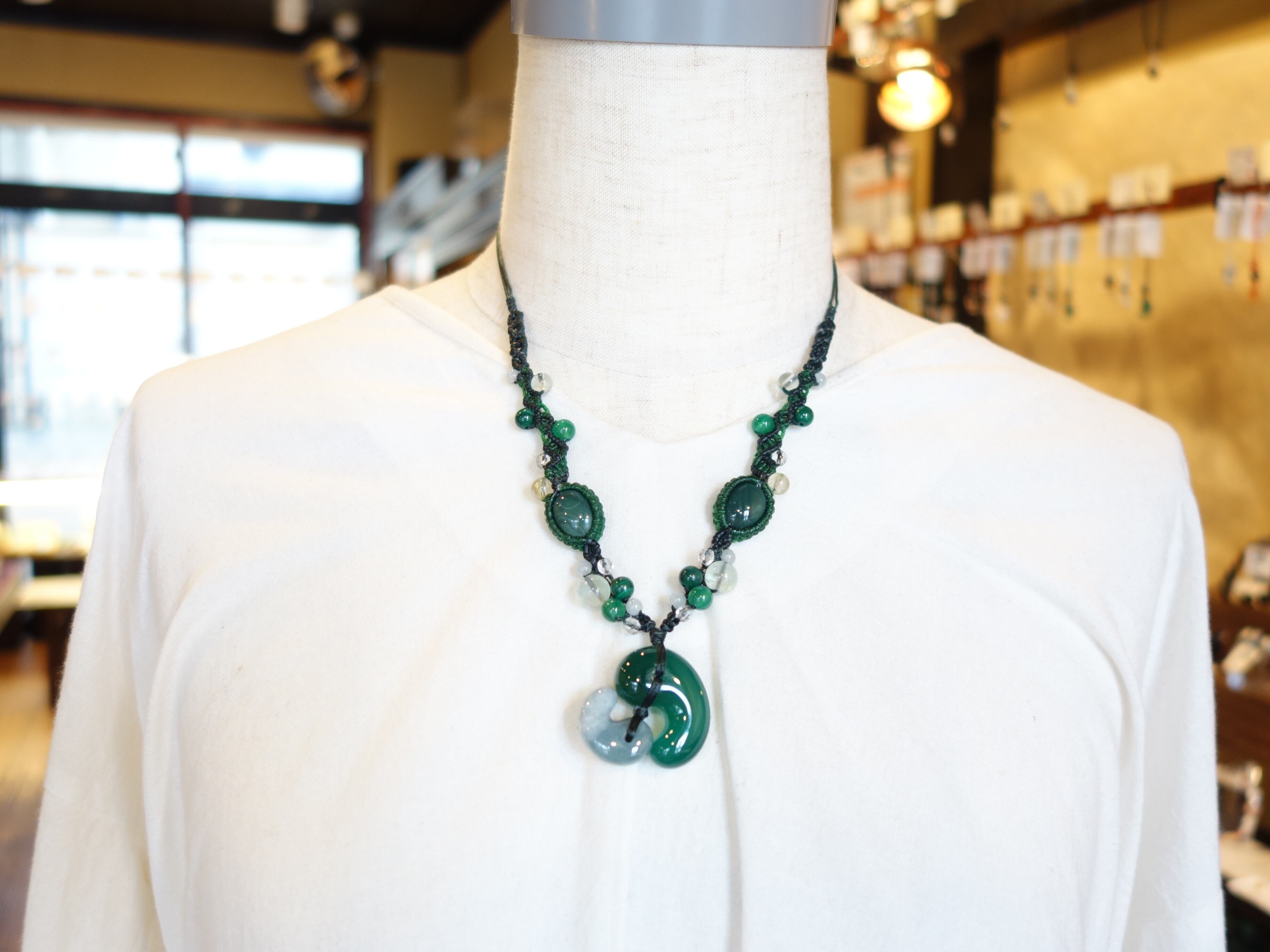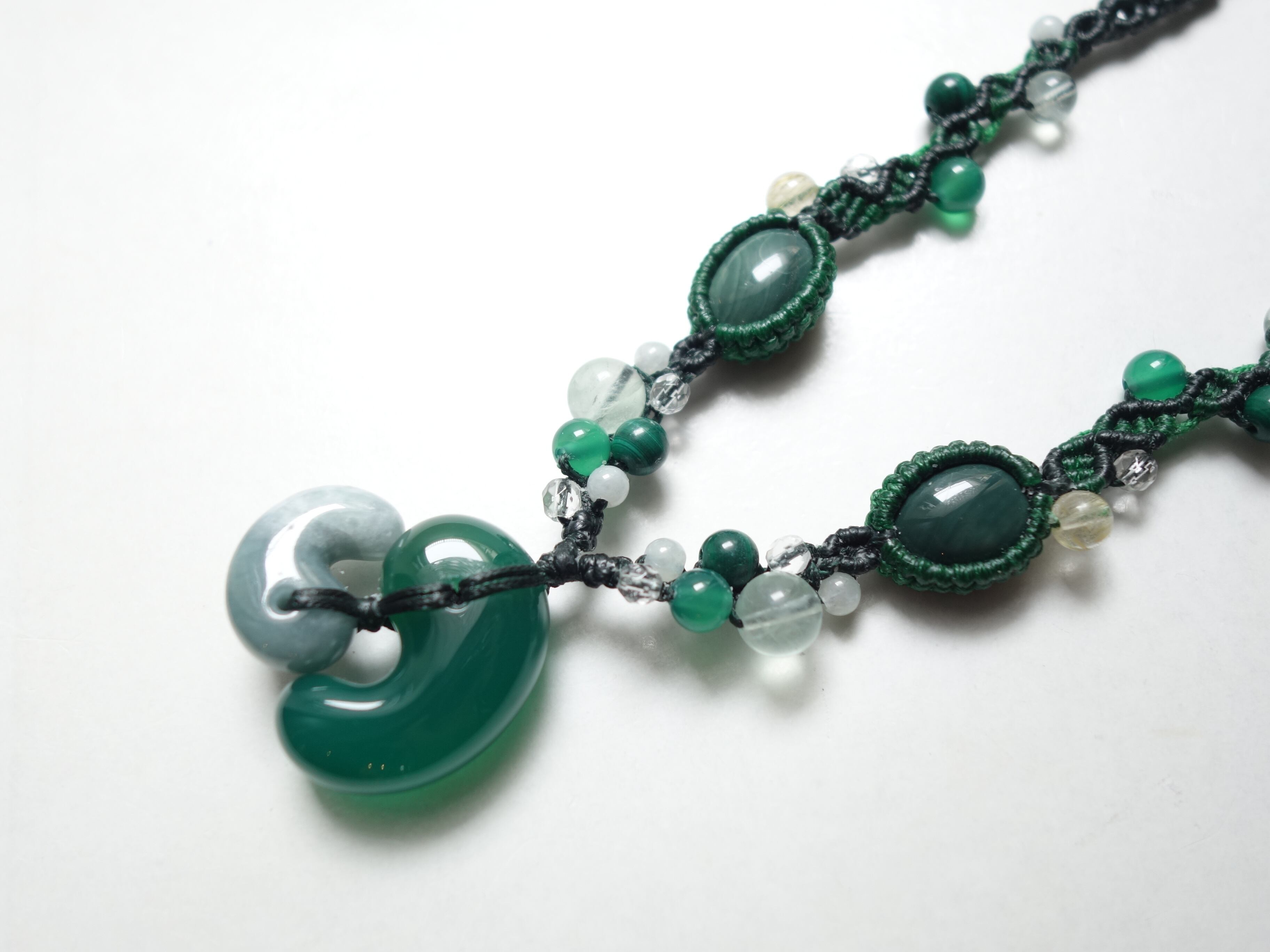 限定【青めのう】30ミリ勾玉と【ブルーグリーンひすい】20ミリ勾玉が主役の結マクラメネックレスです。