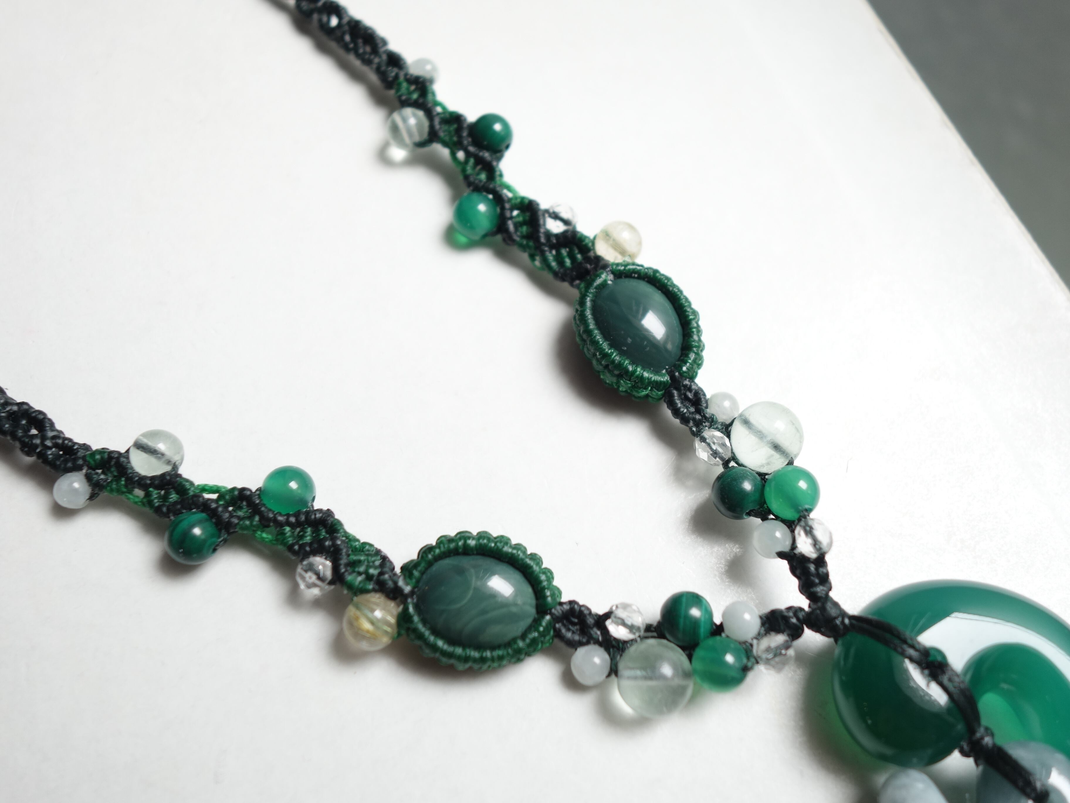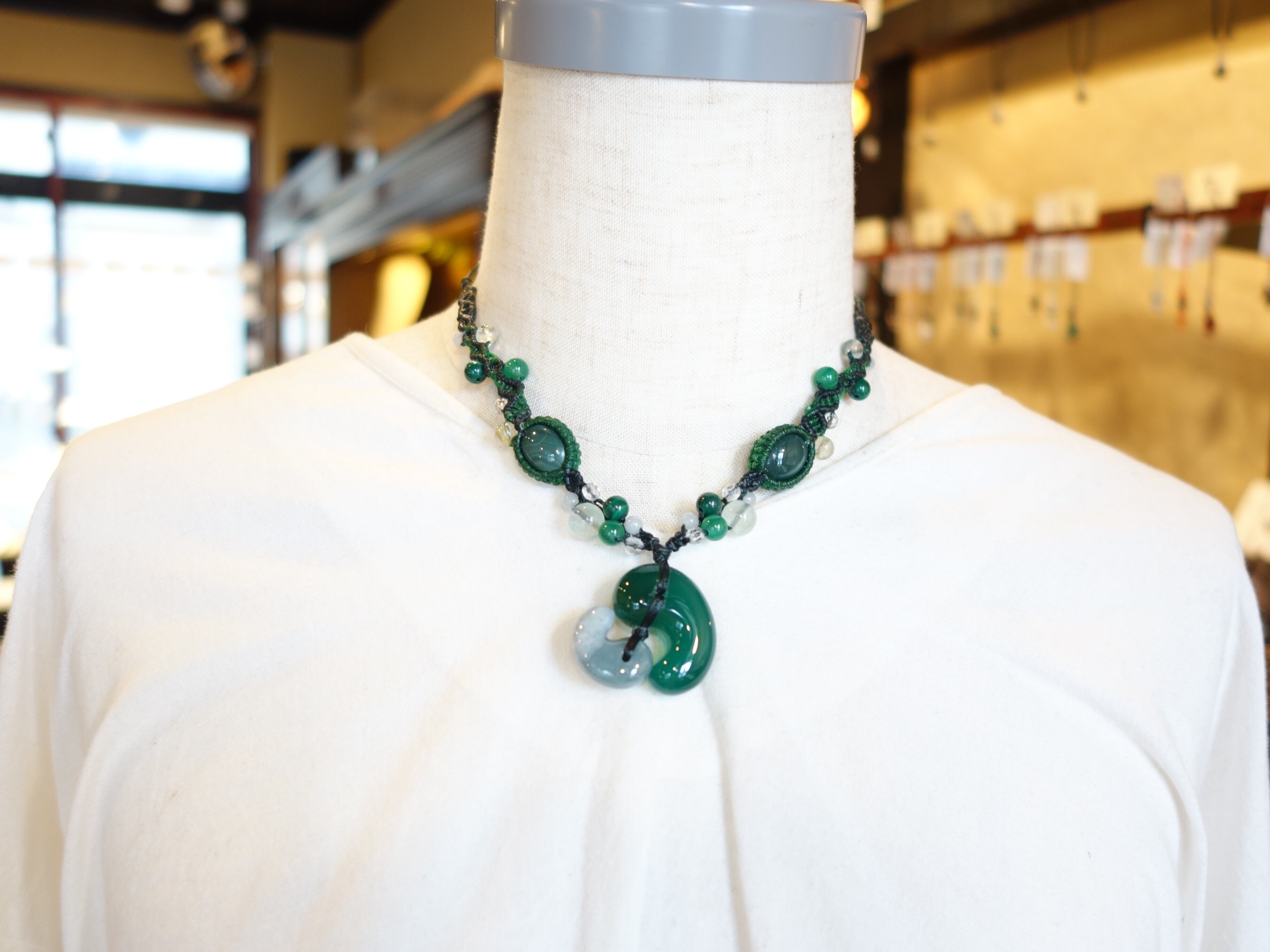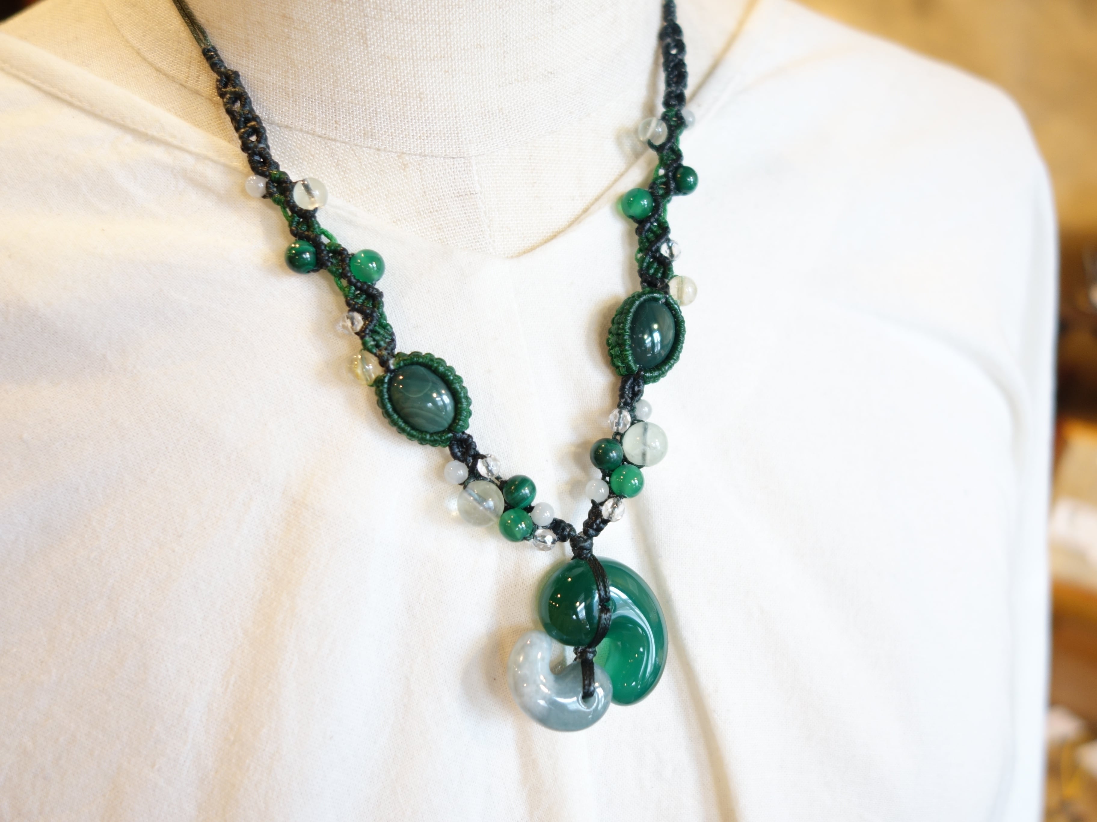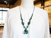 緑色の天然石をたくさん詰め込んだ宝箱のようなネックレスです。