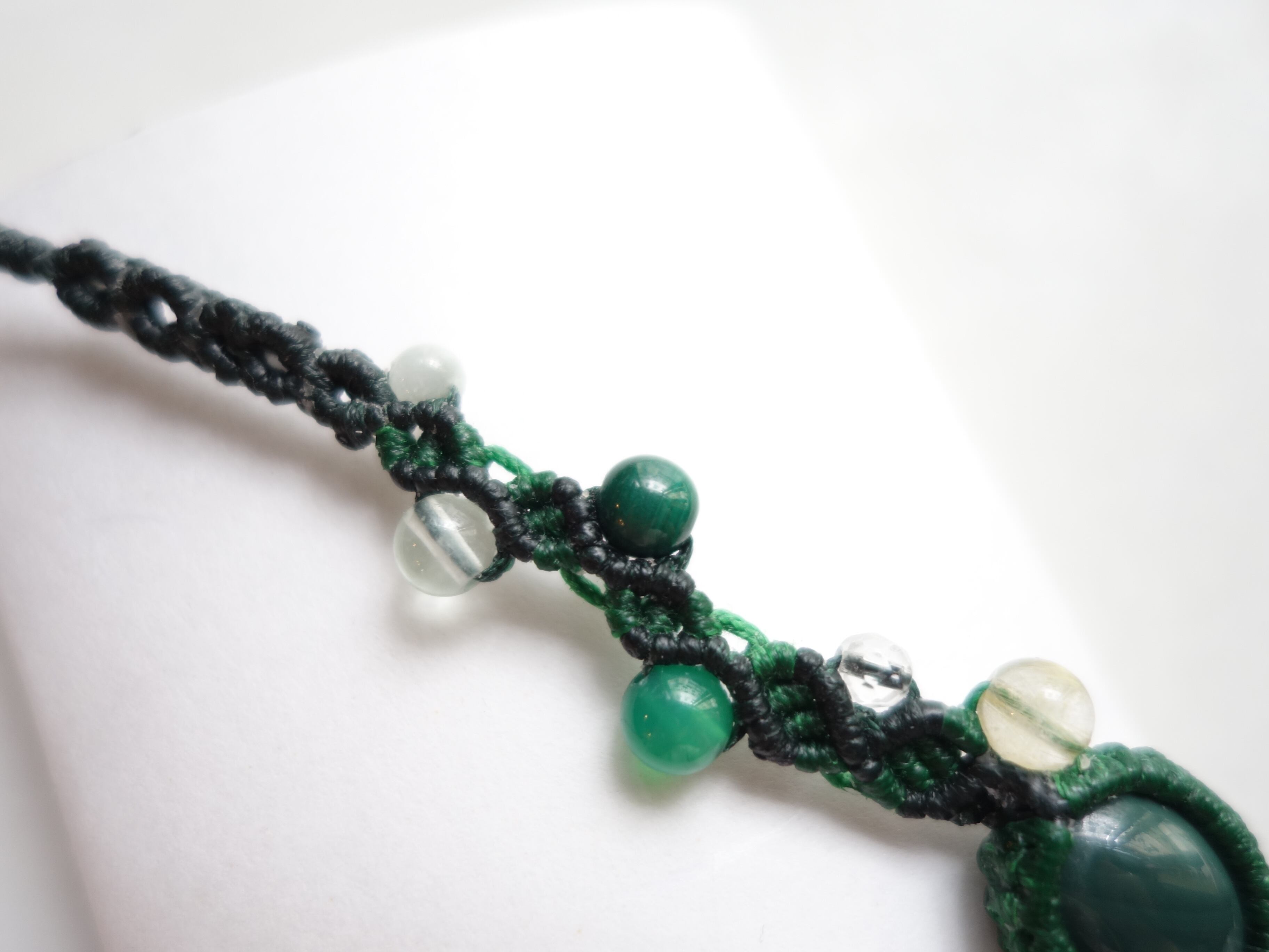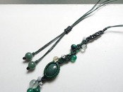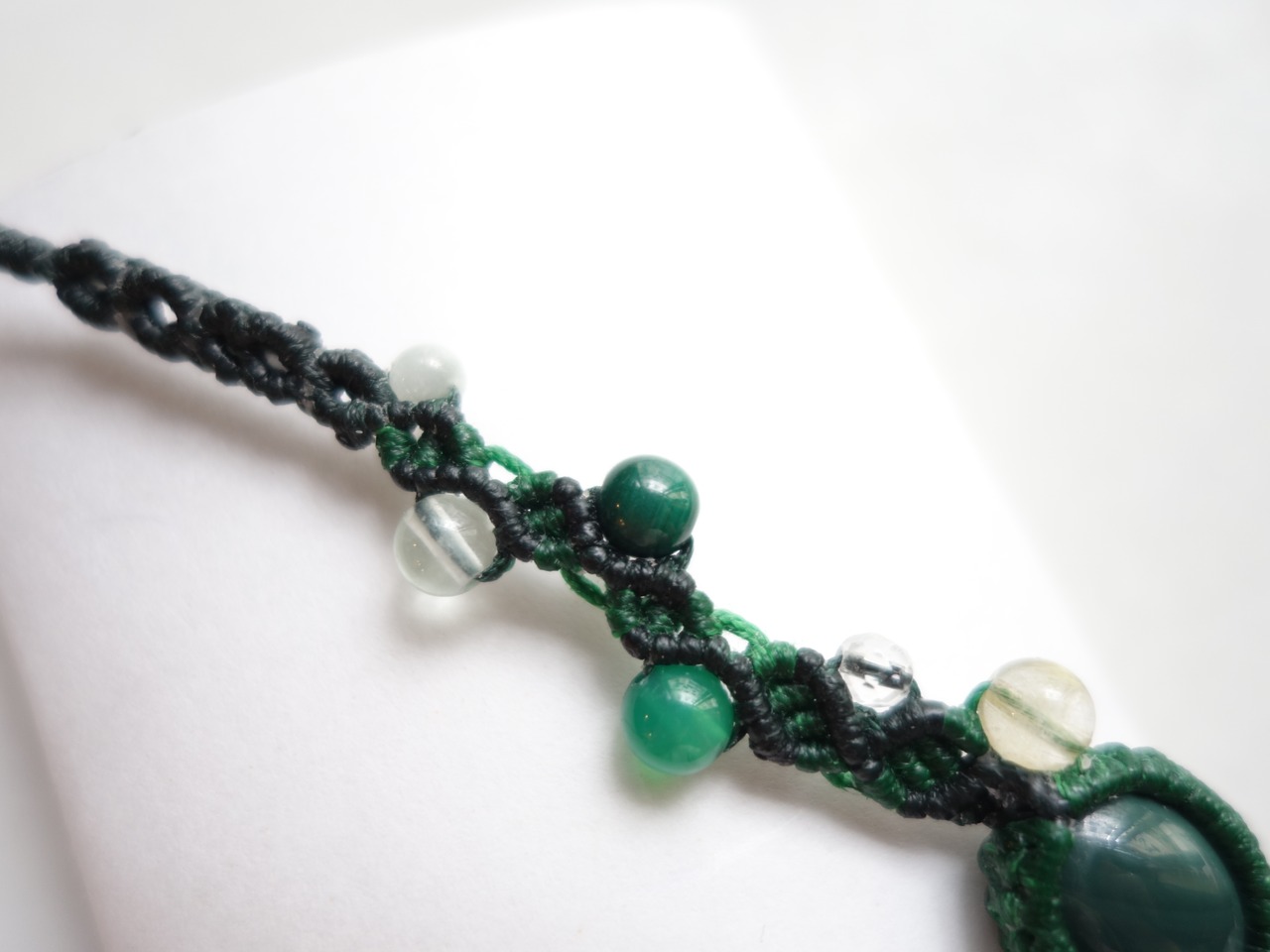 ビーズ…水晶、ヒスイ、青めのう(緑)、マラカイト、グリーンフローライト、ルチルクォーツ、アベンチュリン