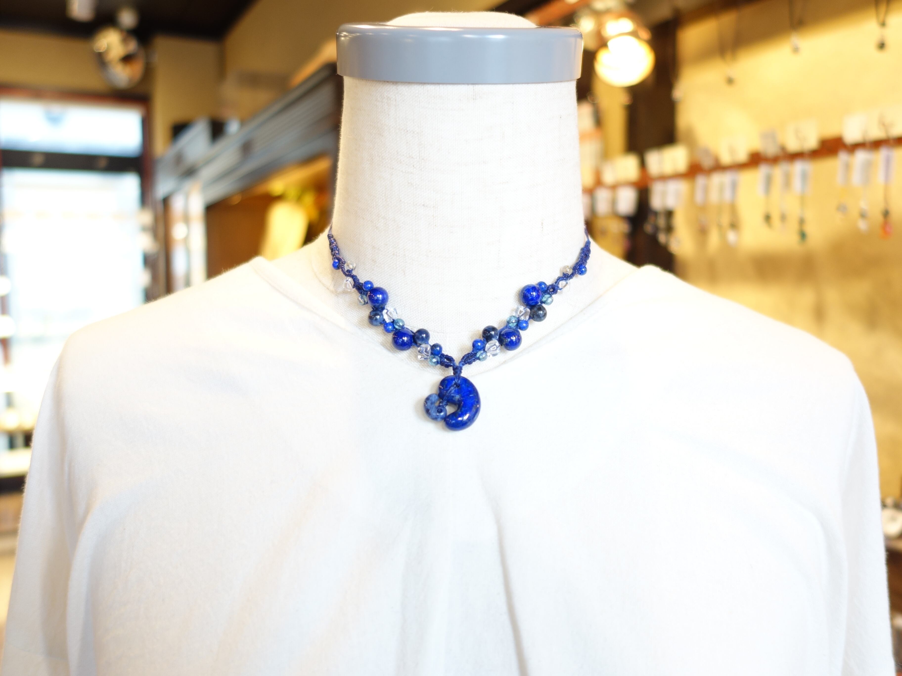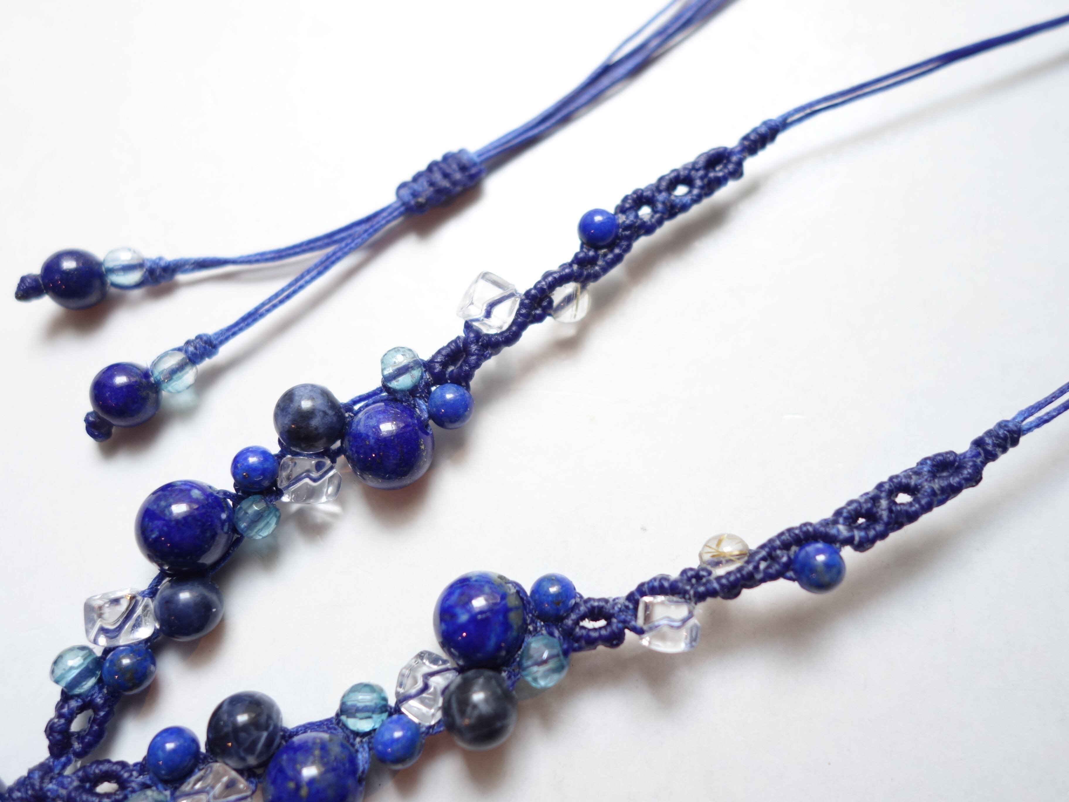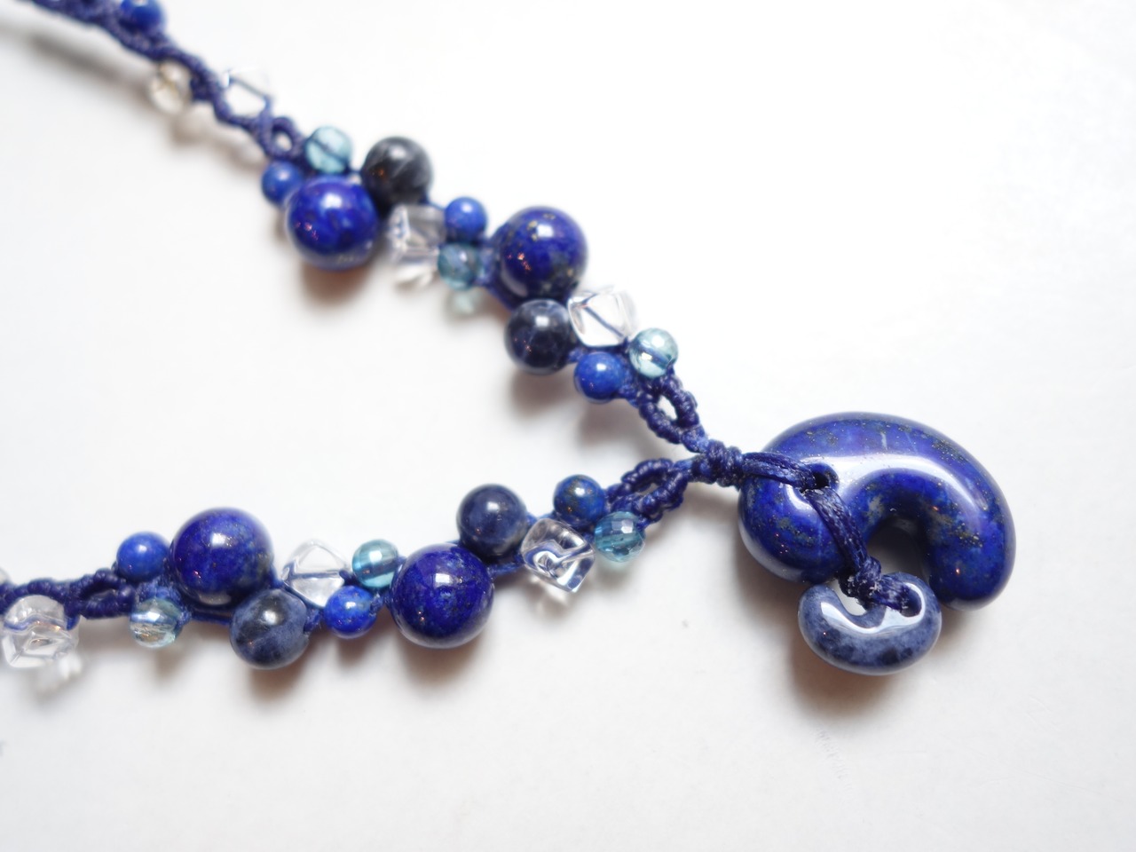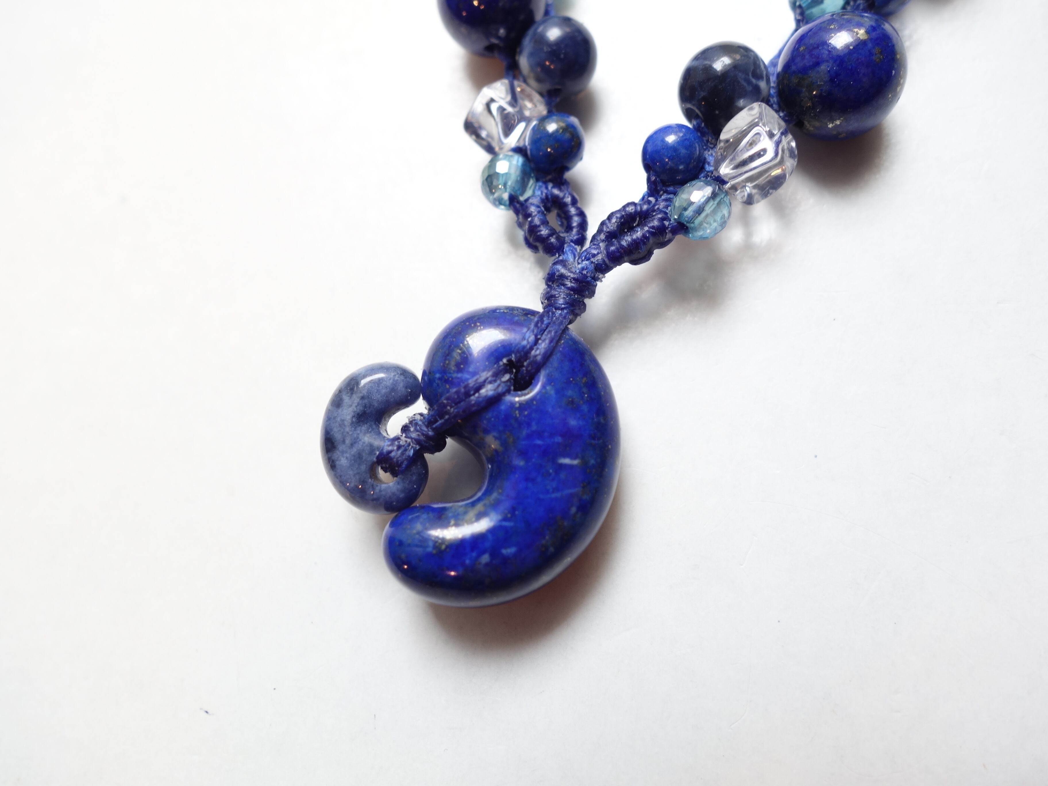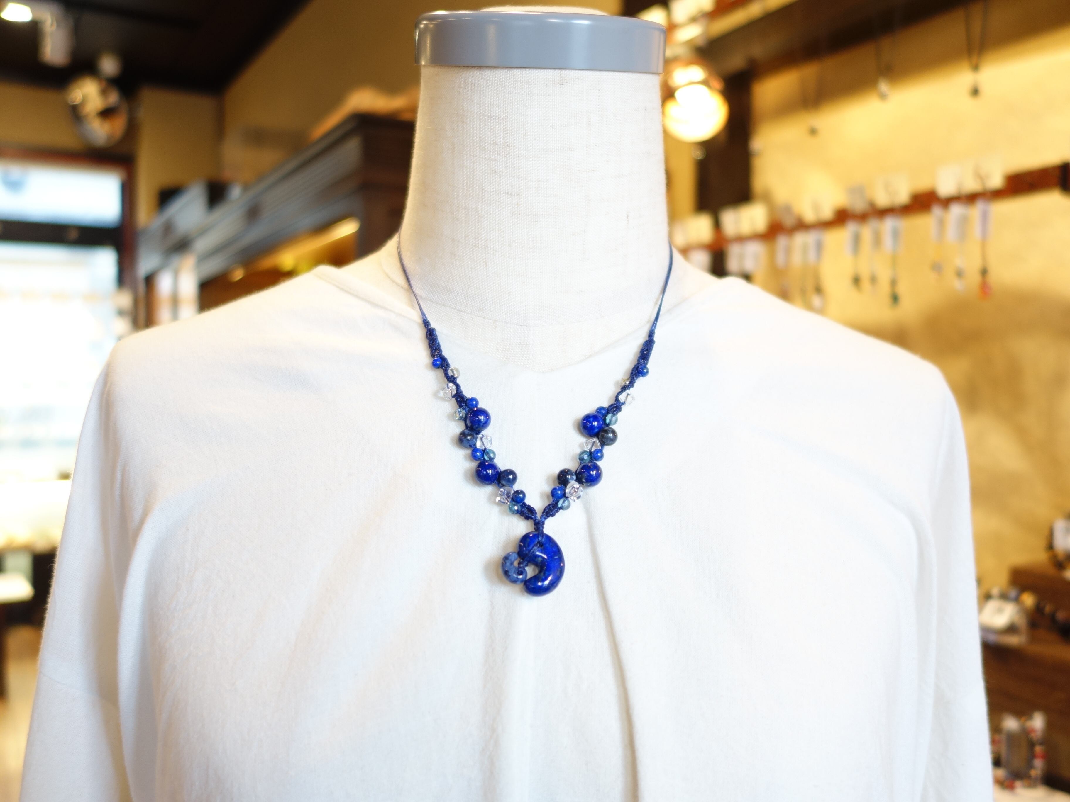 今回はラピスラズリを勾玉とビーズでたくさん使用しながら、