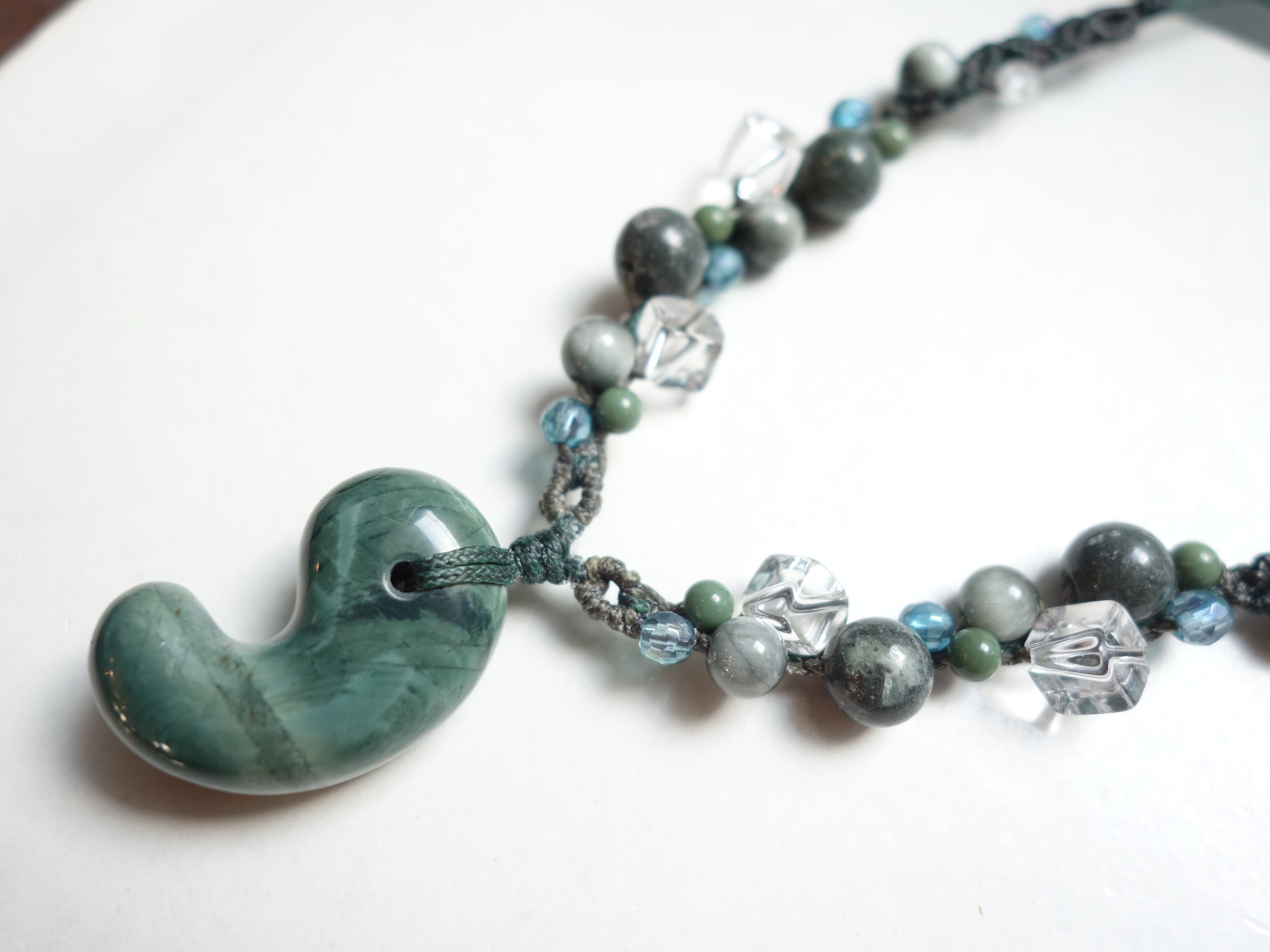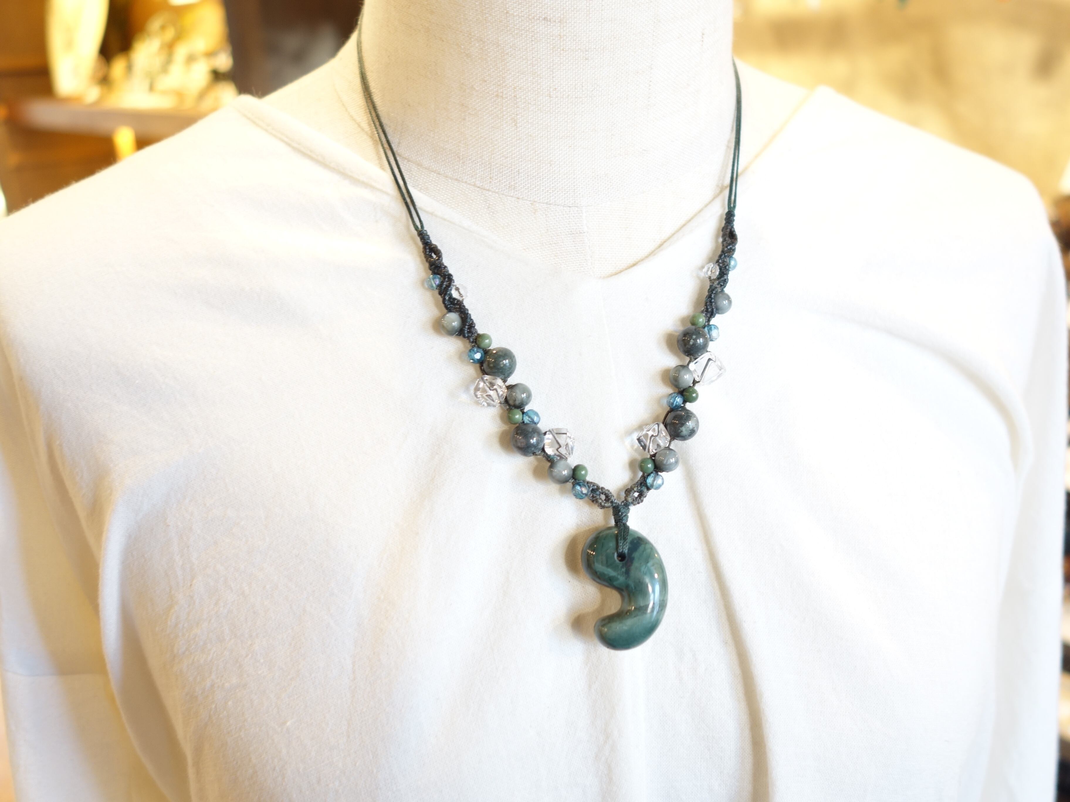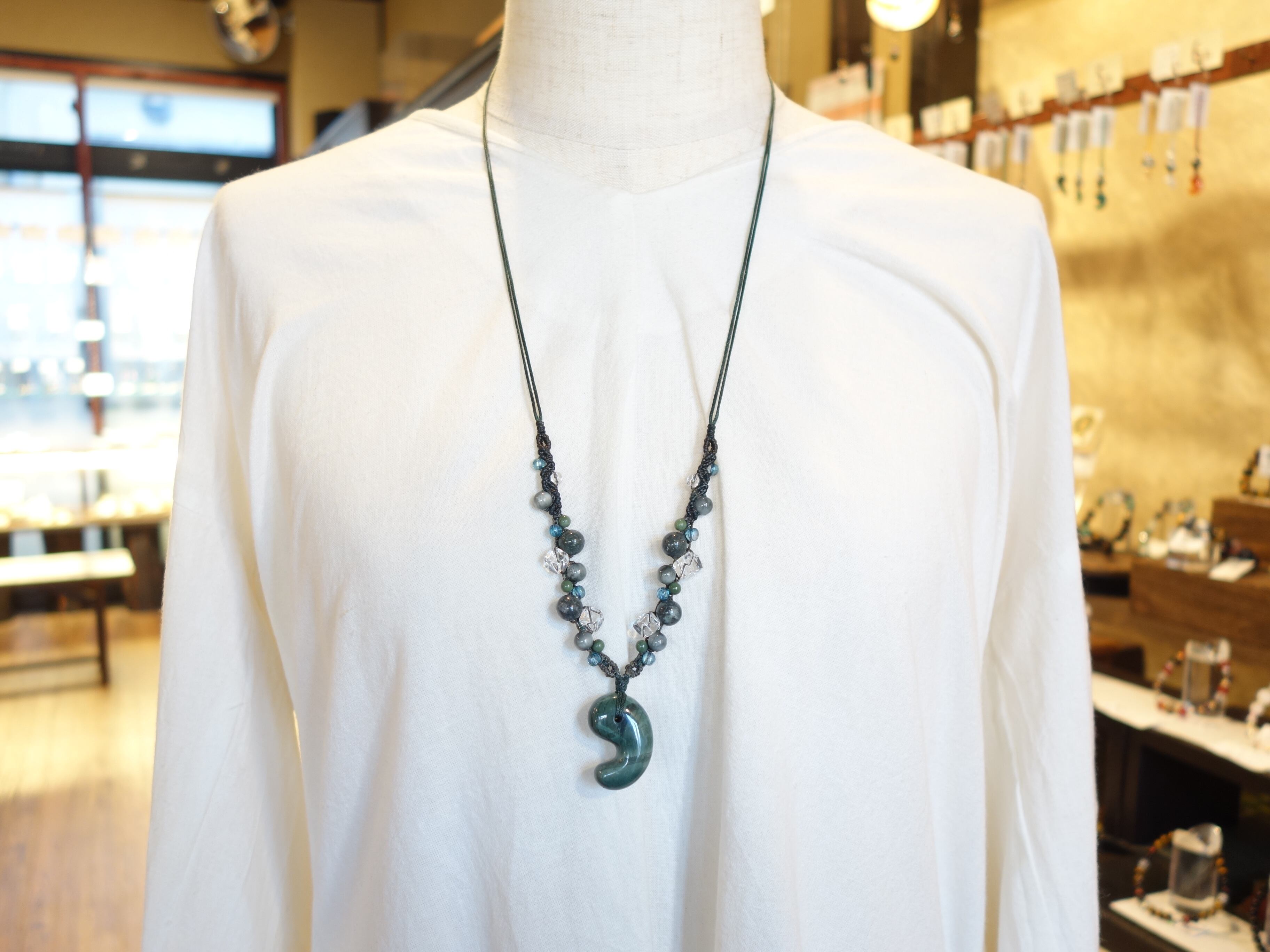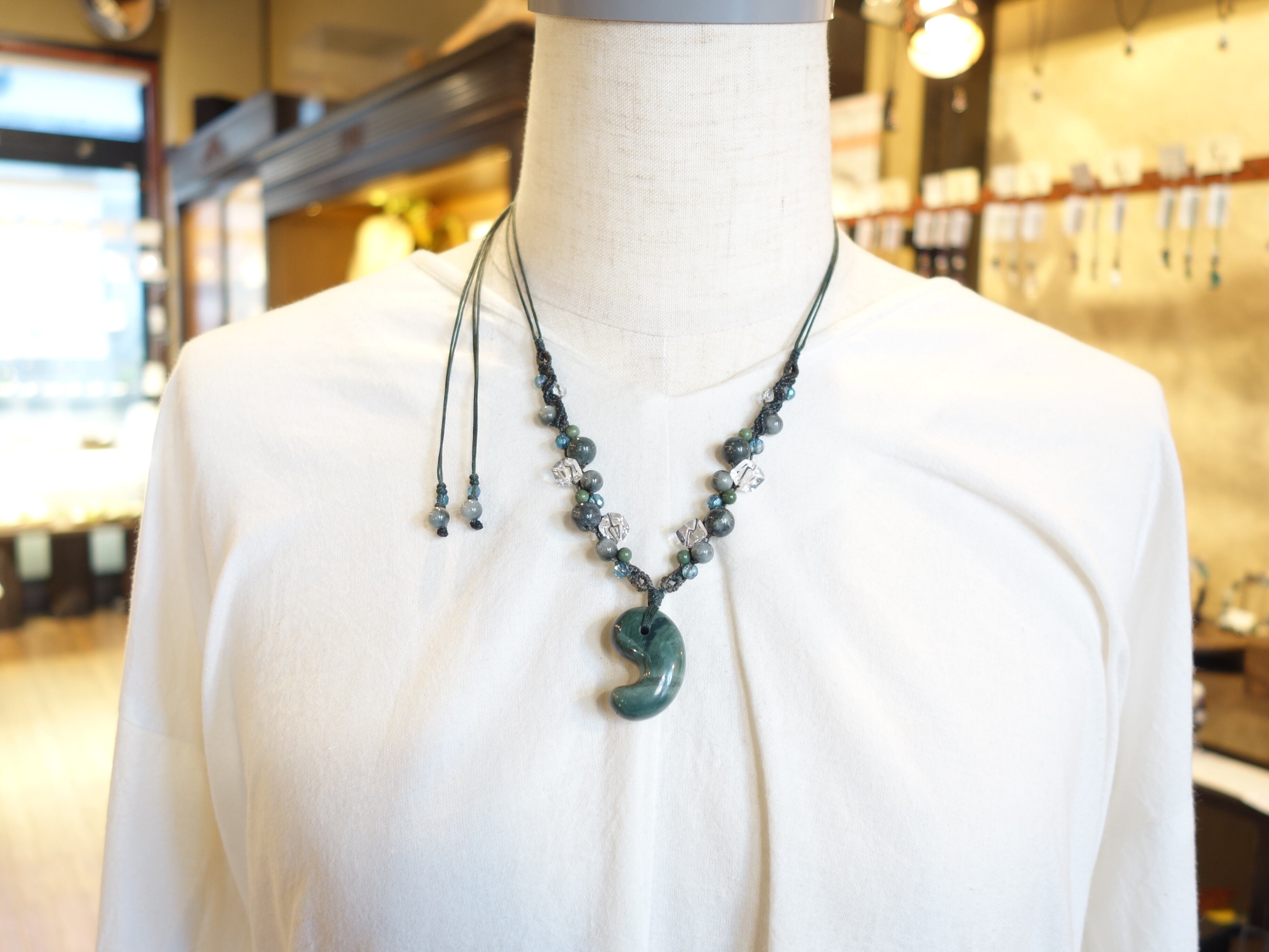 新作【花仙碧玉】30ミリ勾玉の調節式ネックレスです。