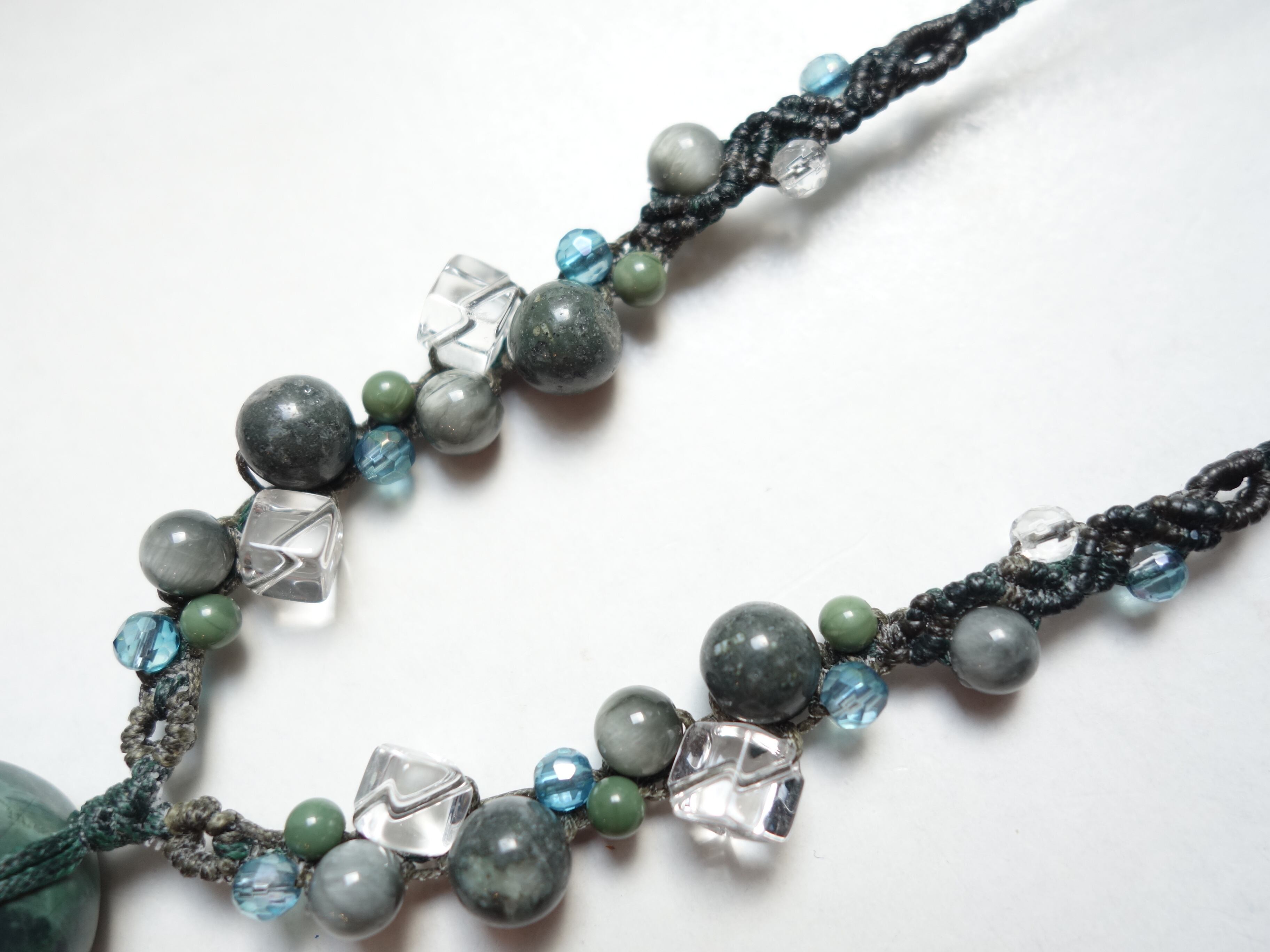 首周りには、「出雲鏡石」ビーズなどたくさんの天然石を編み込んで華やかに仕上げました。