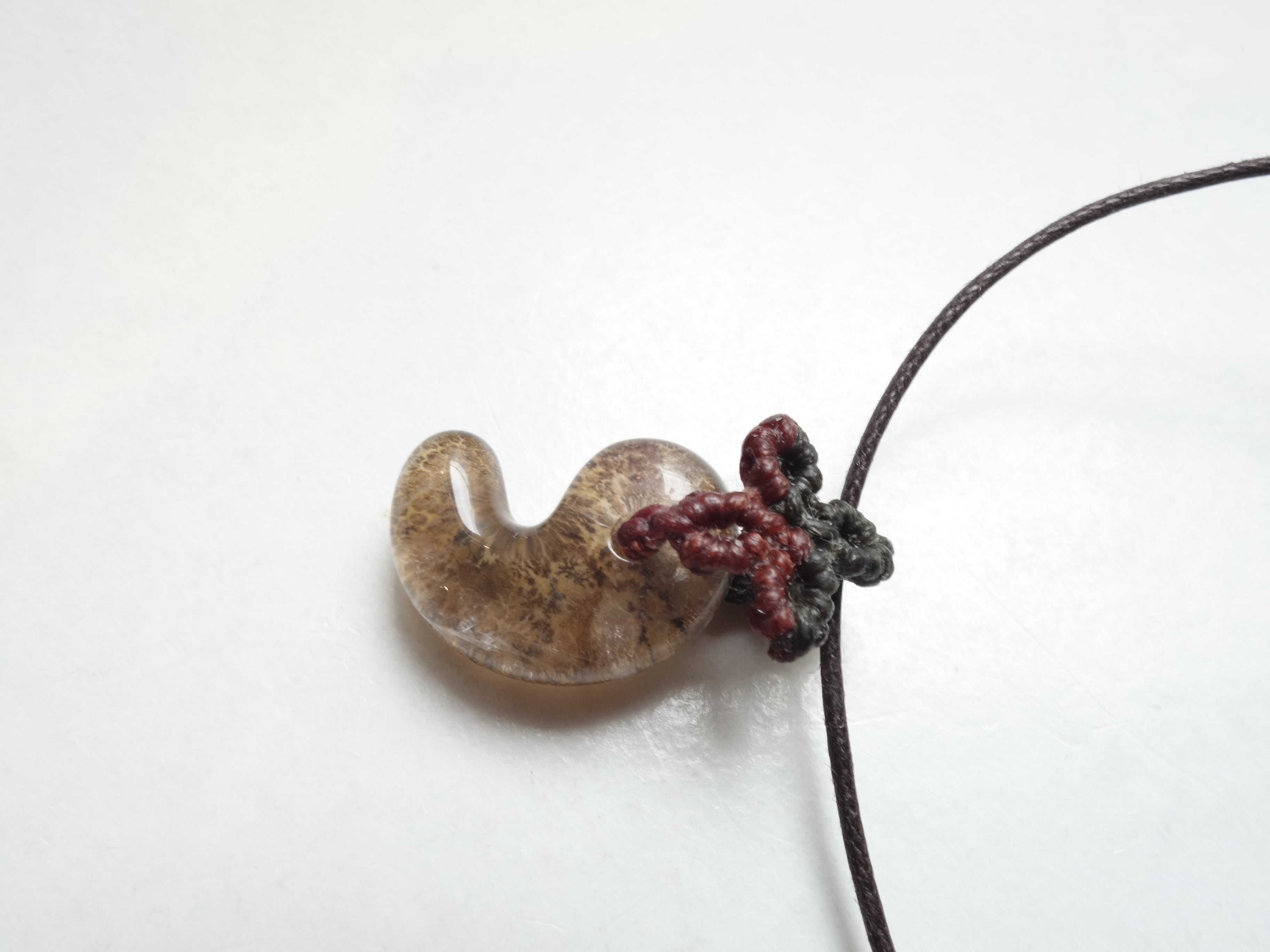 勾玉のうえには植物モチーフのマクラメを入れて…