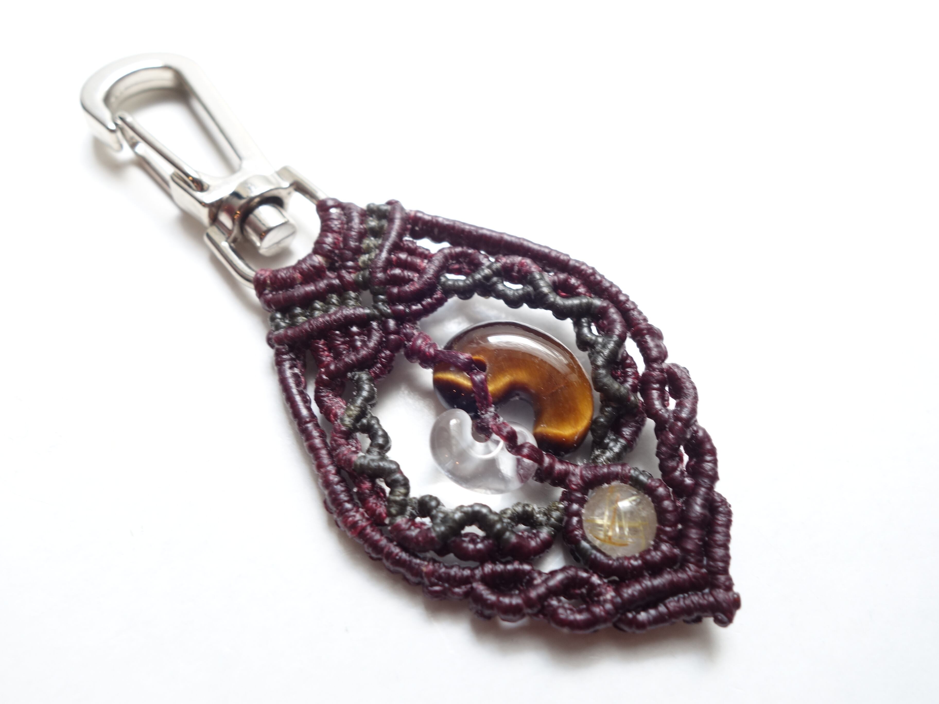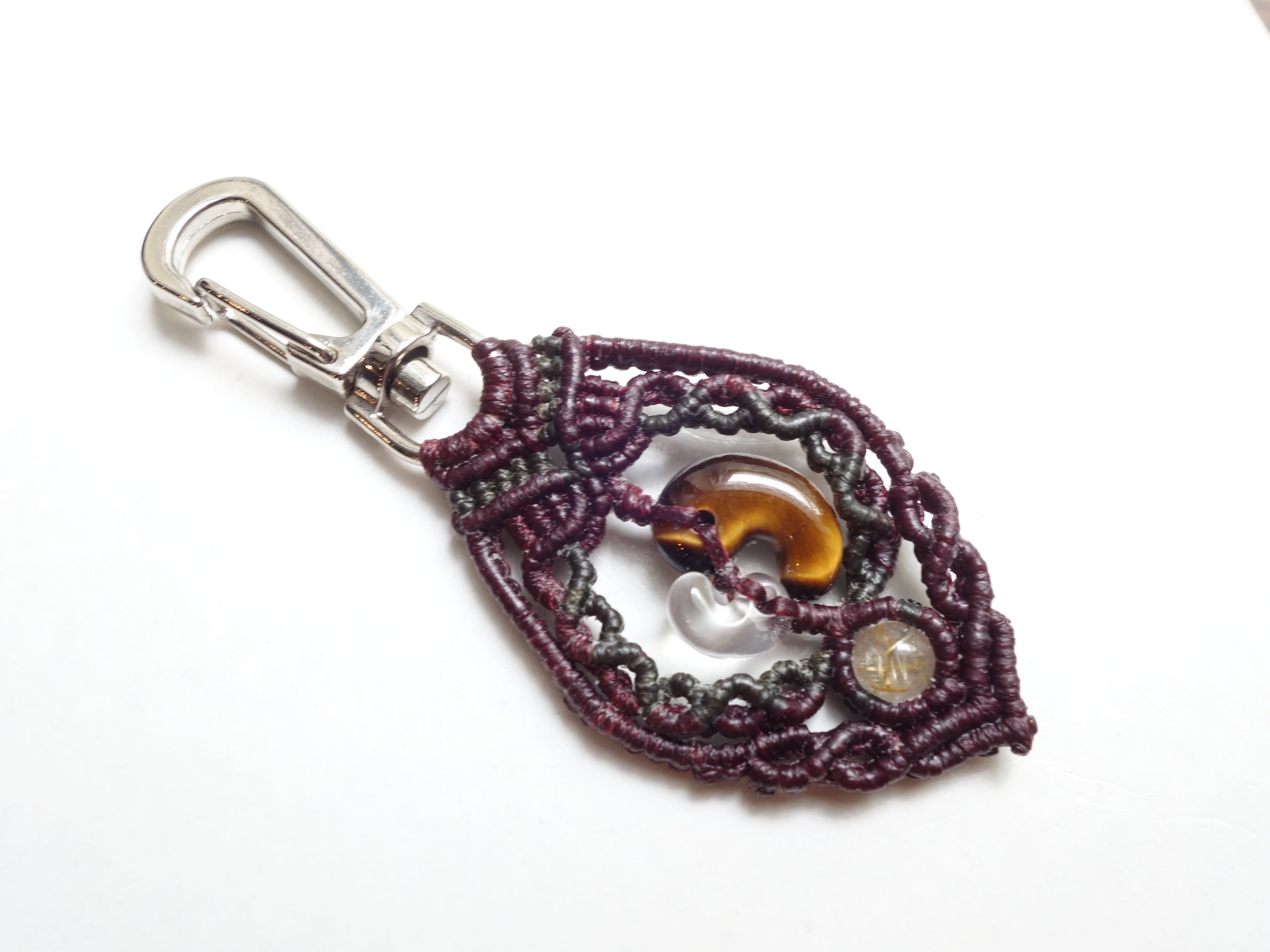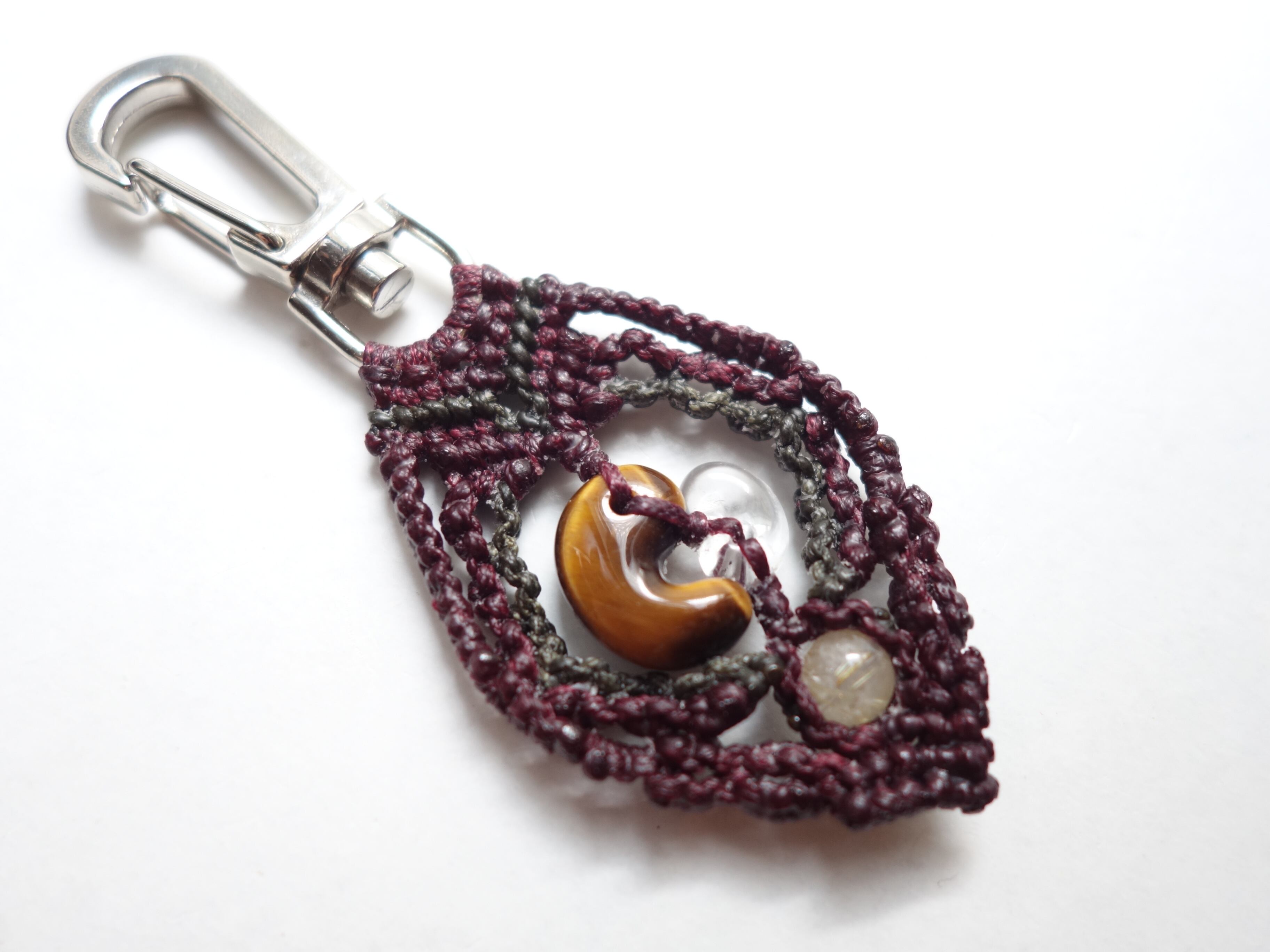 【タイガーアイ】16ミリ勾玉と【水晶】10ミリ勾玉をマクラメの額縁にそっと閉じ込めたオリジナルデザインのキーホルダーです。