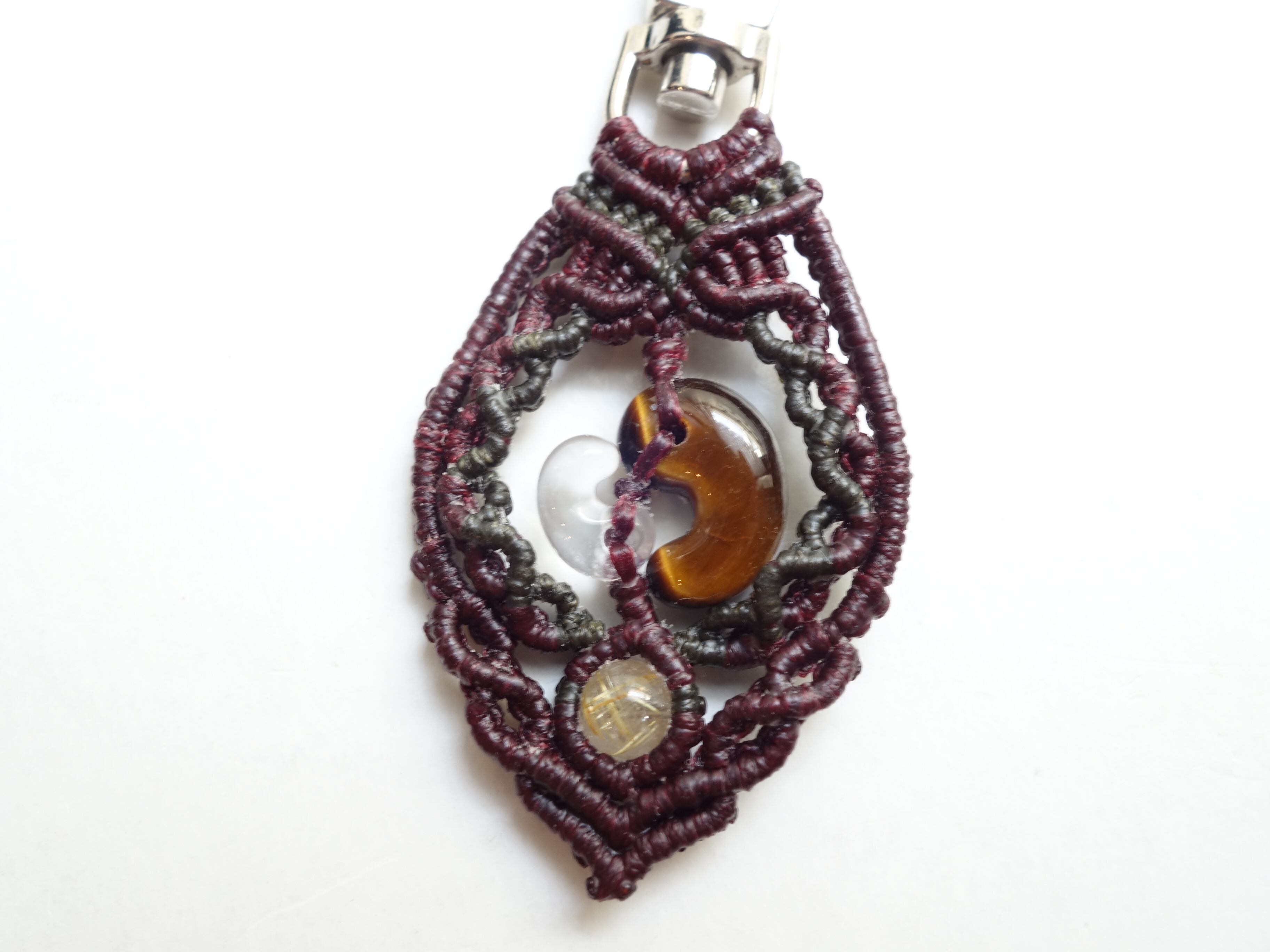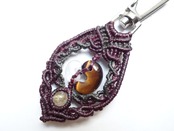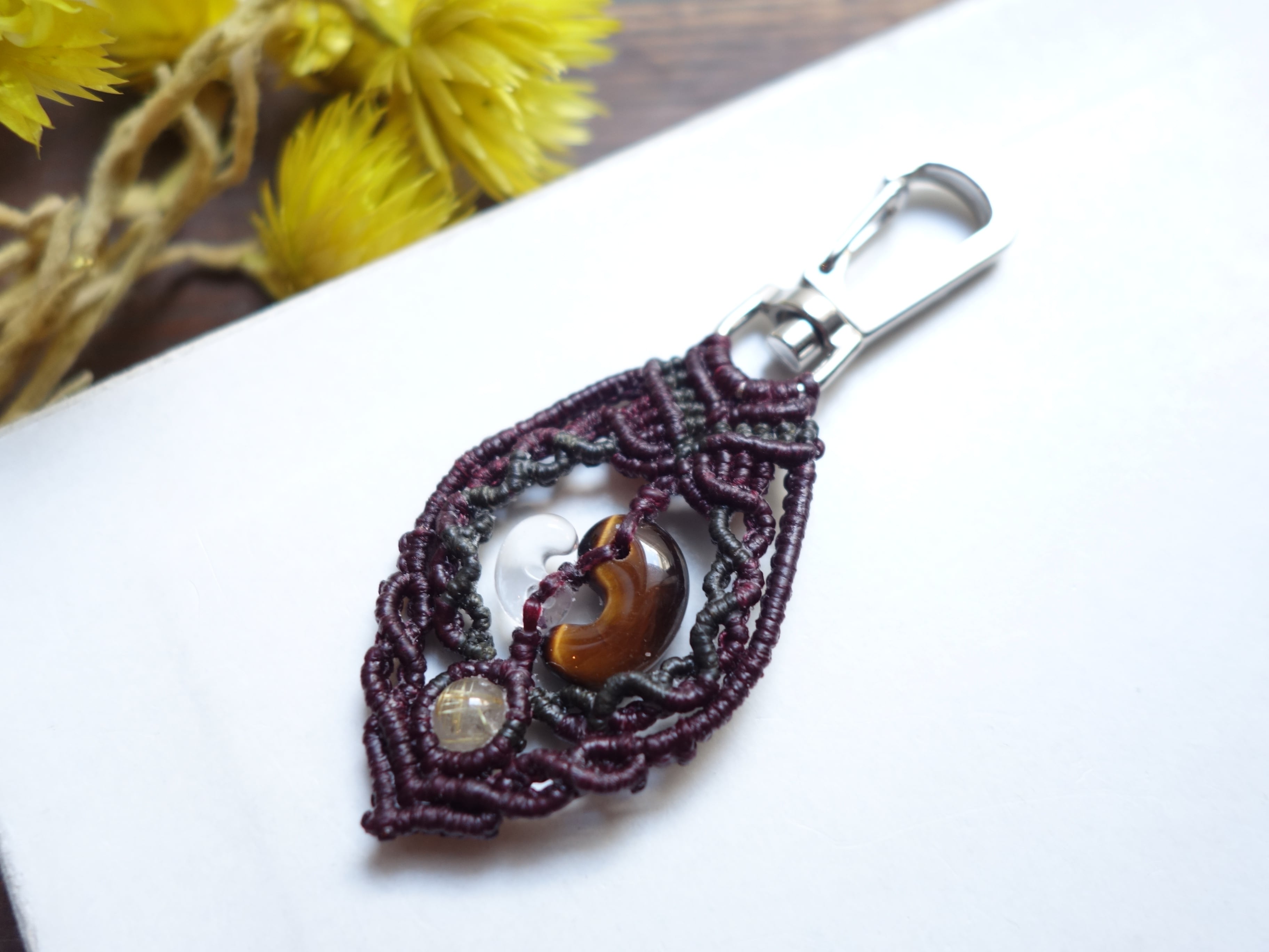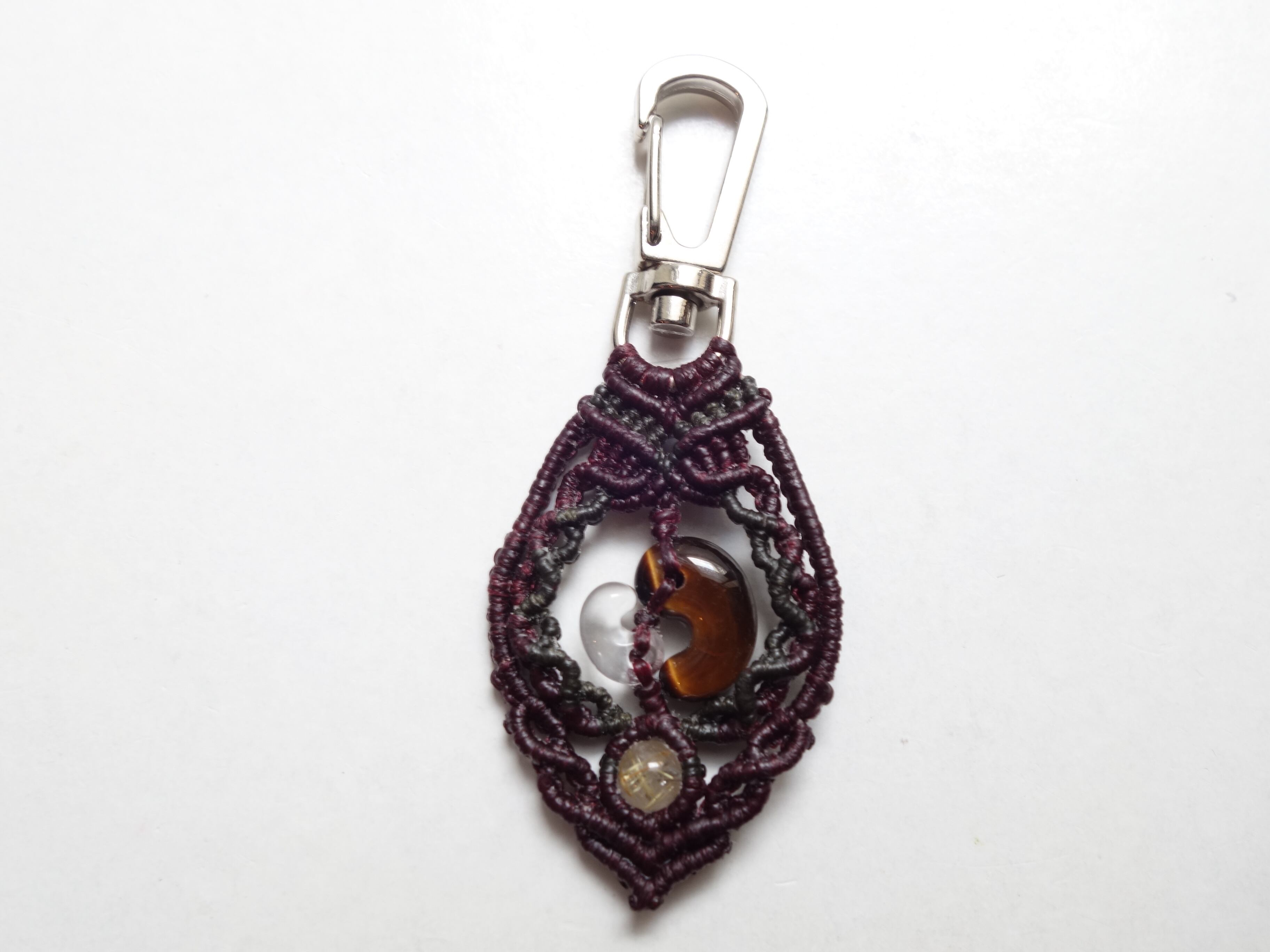 【タイガーアイ】16ミリ勾玉と【水晶】10ミリ勾玉をマクラメの額縁にそっと閉じ込めたオリジナルデザインのキーホルダーです。