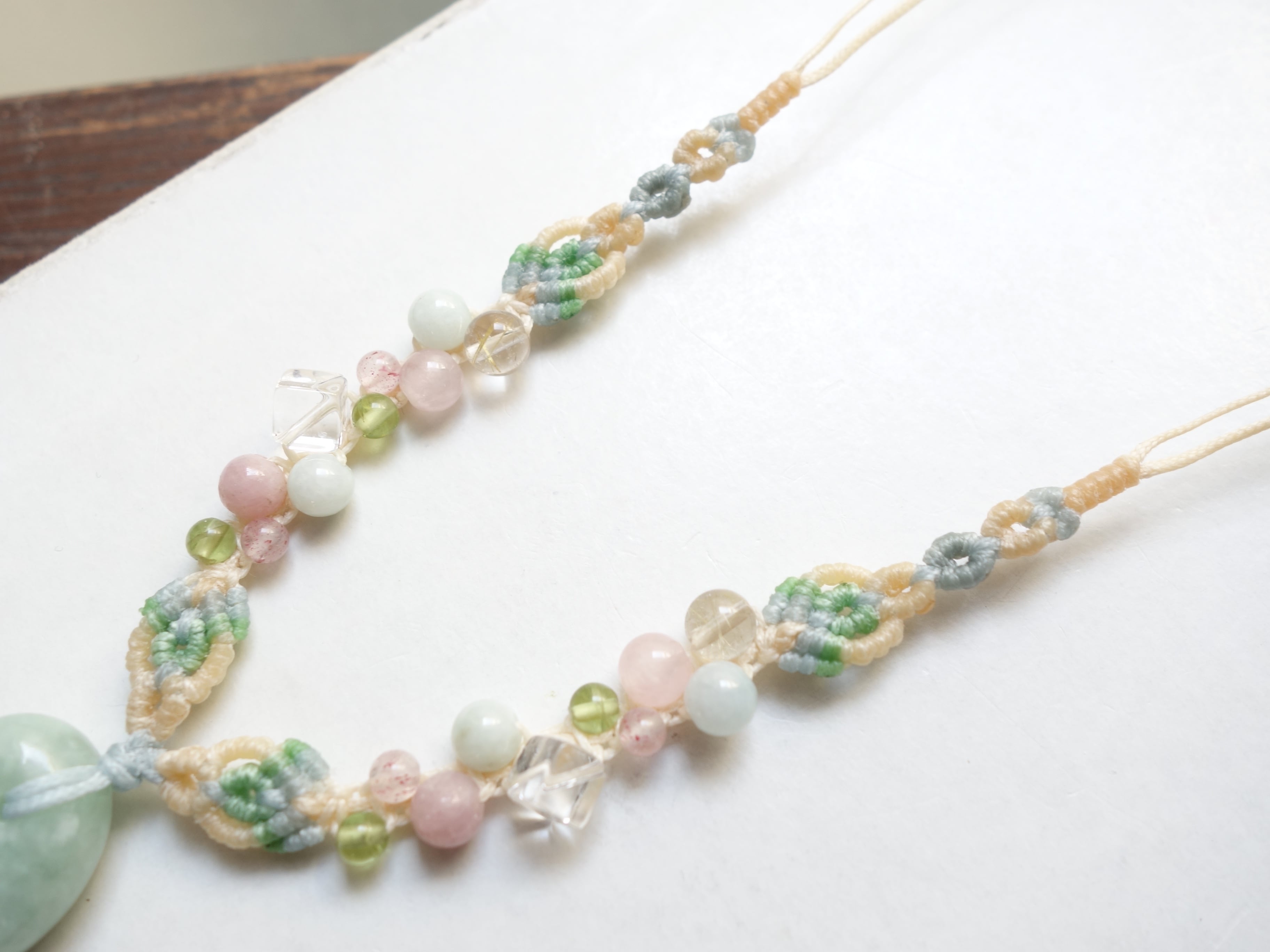 グラデーションのマクラメモチーフと天然石で、明るい庭園のイメージで製作しました。