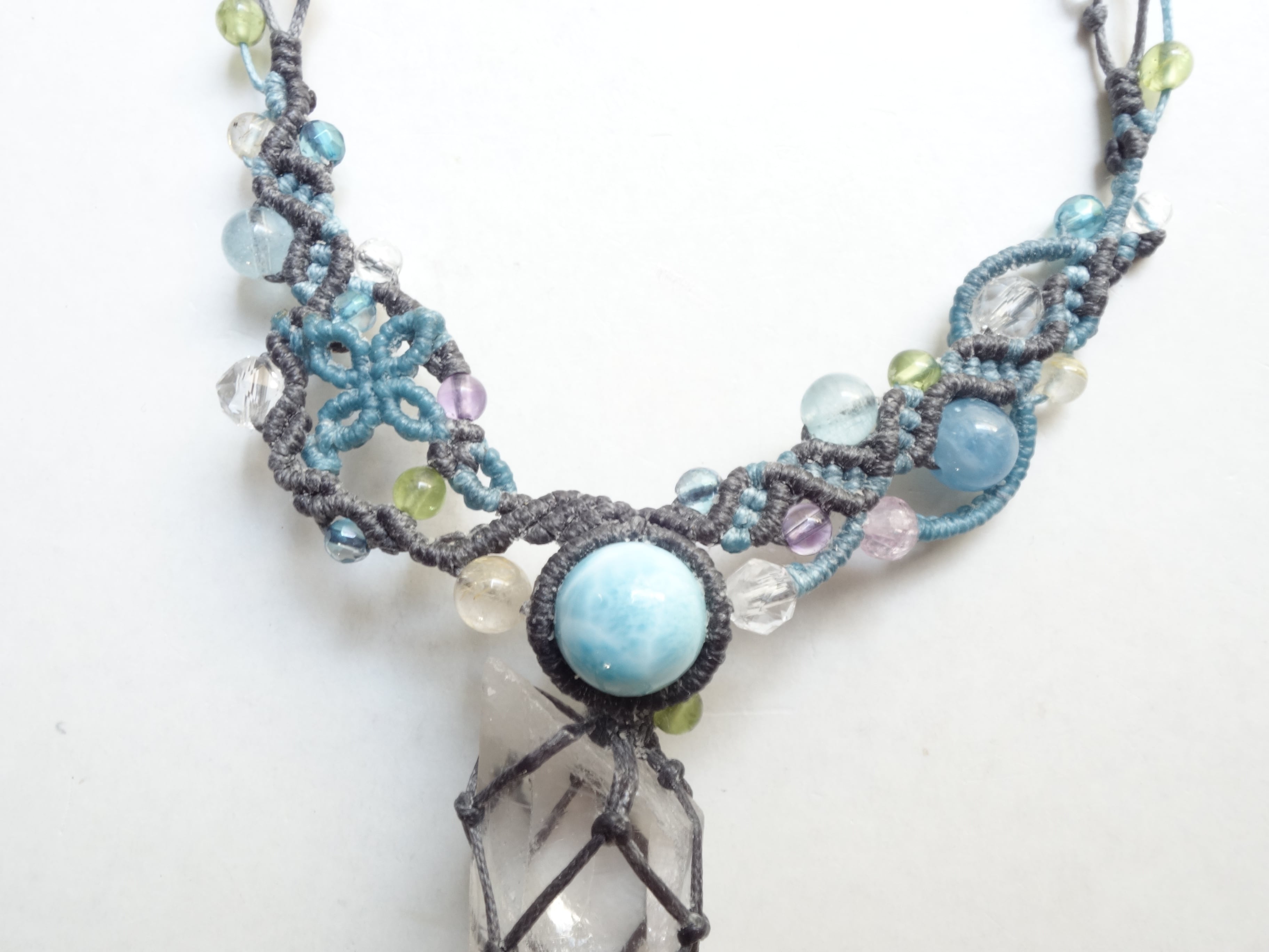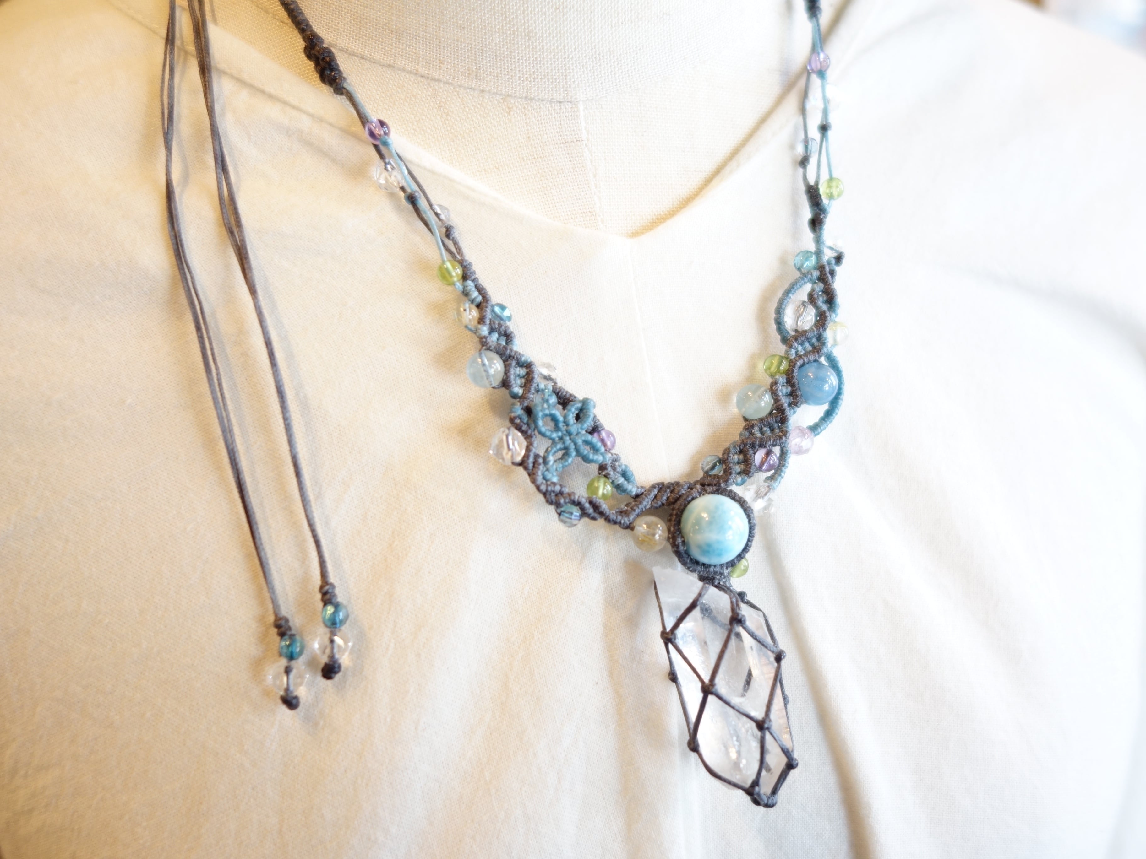 原石の大胆な斜めラインを活かして、ラリマーとランダムなマクラメで編み込んで…