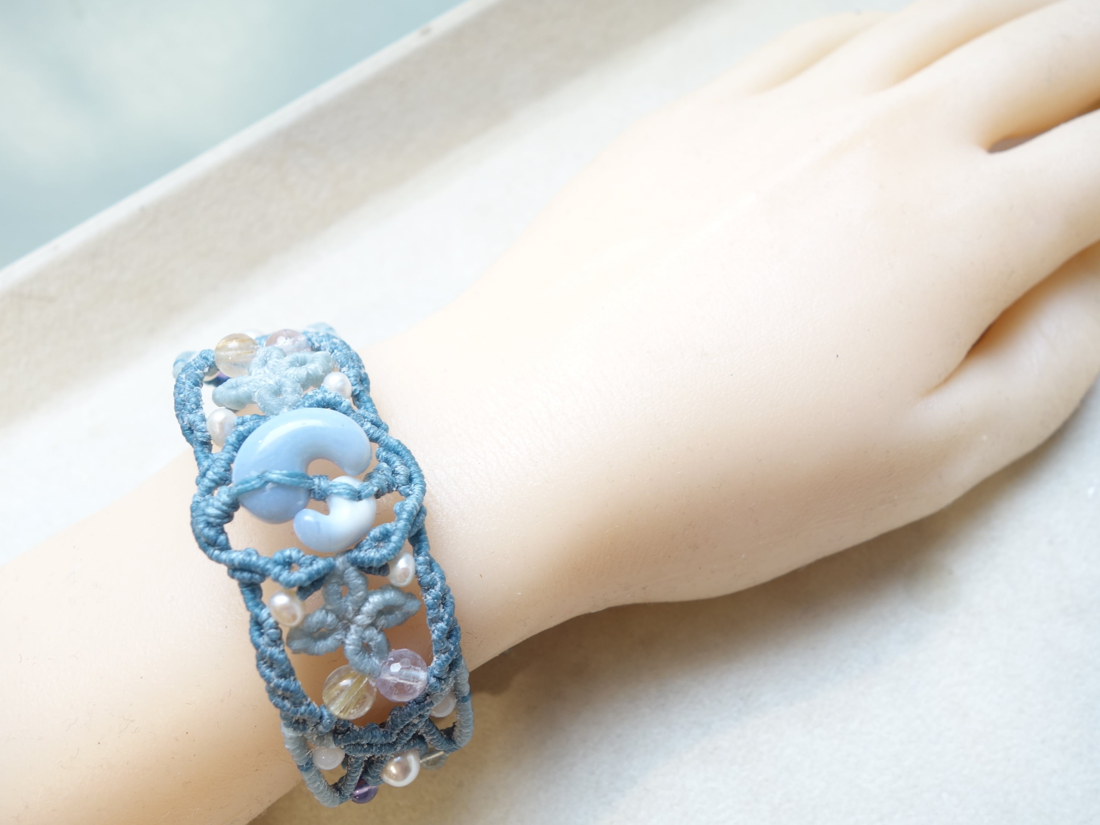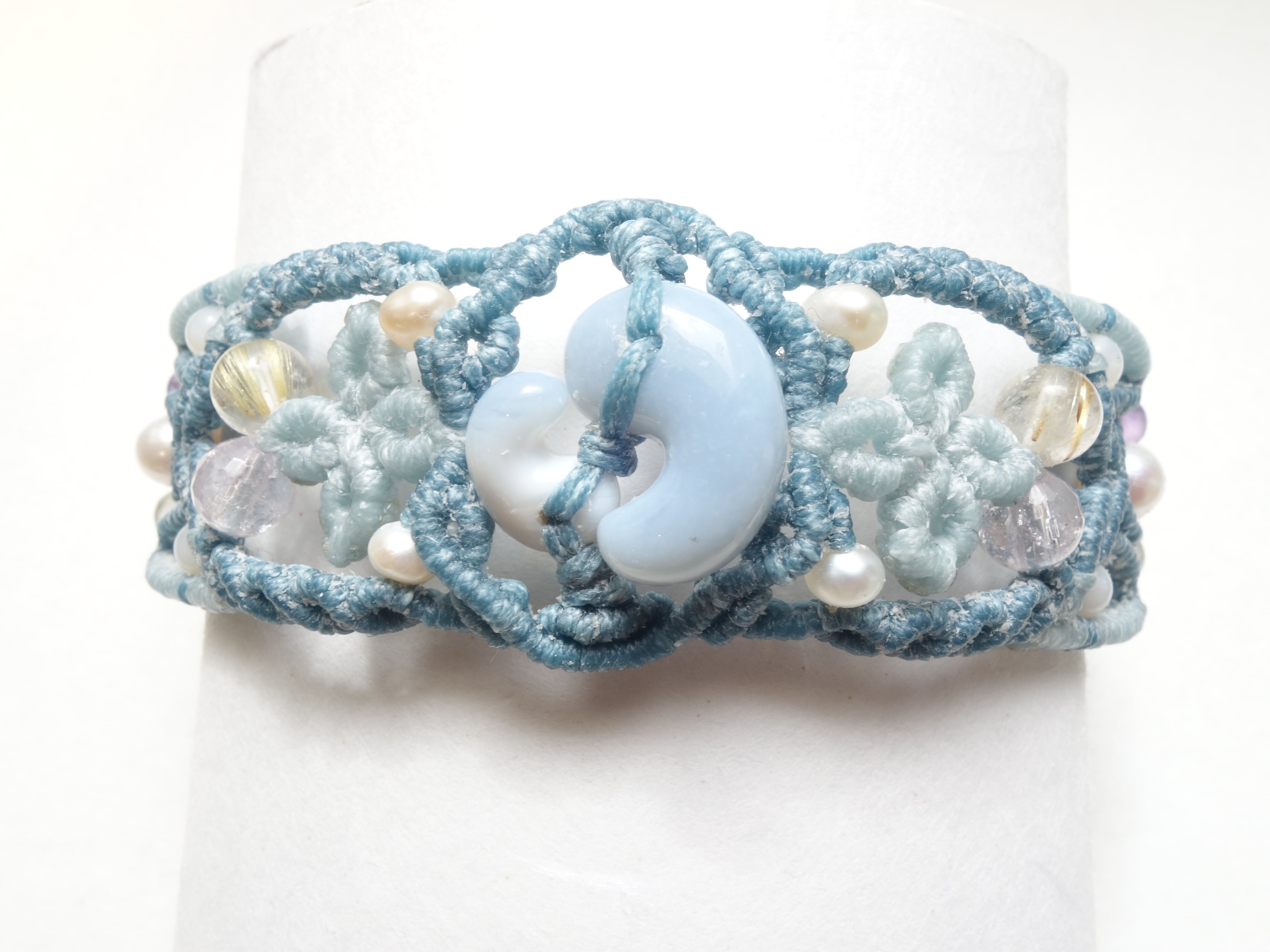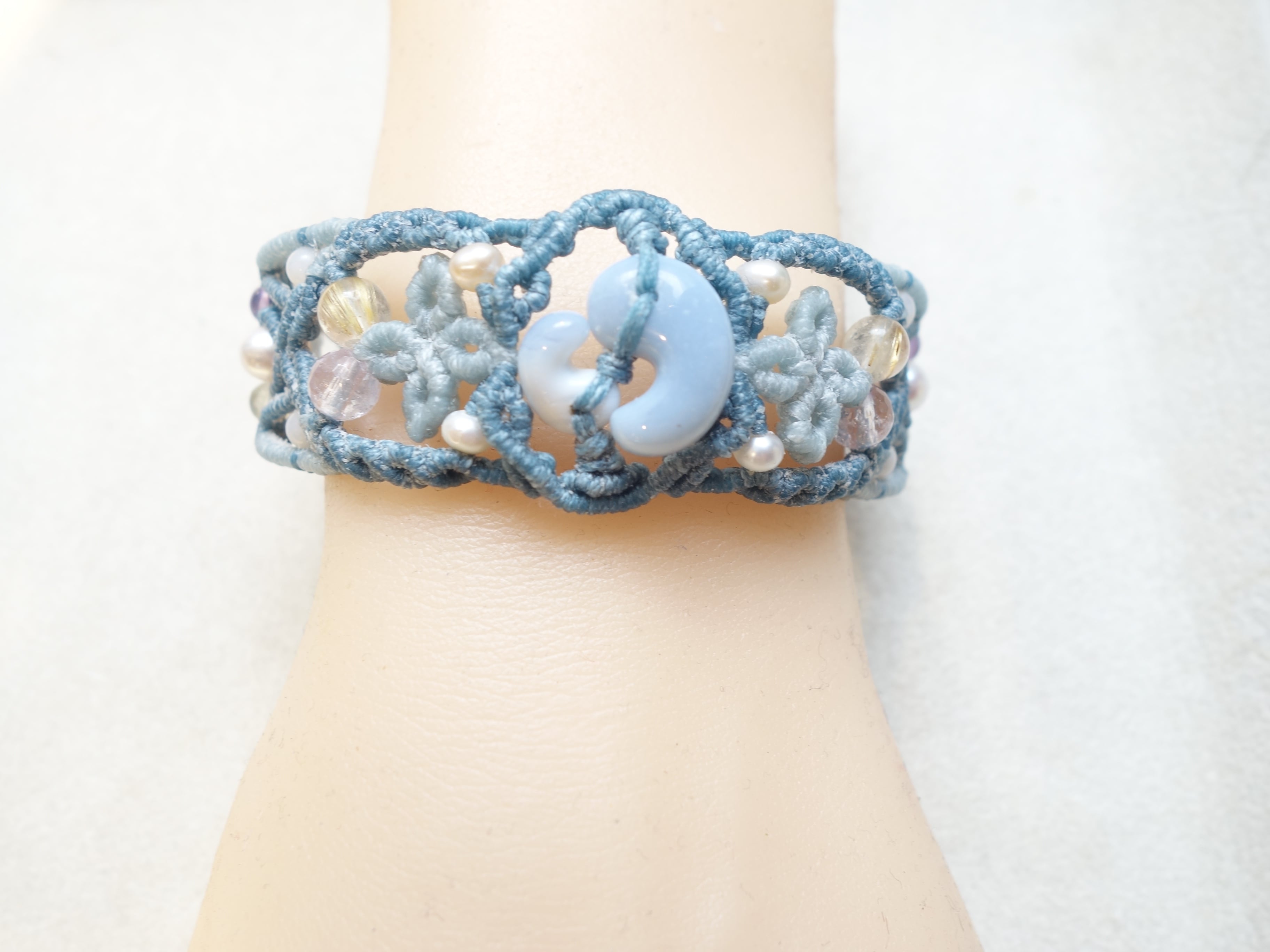 【ブルーオパール】16ミリ×10ミリの結デザイン・マクラメバングルです。