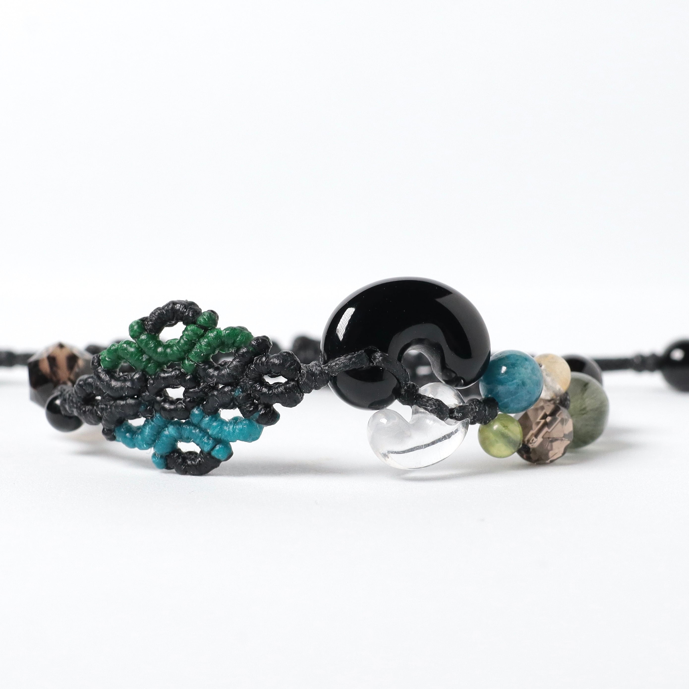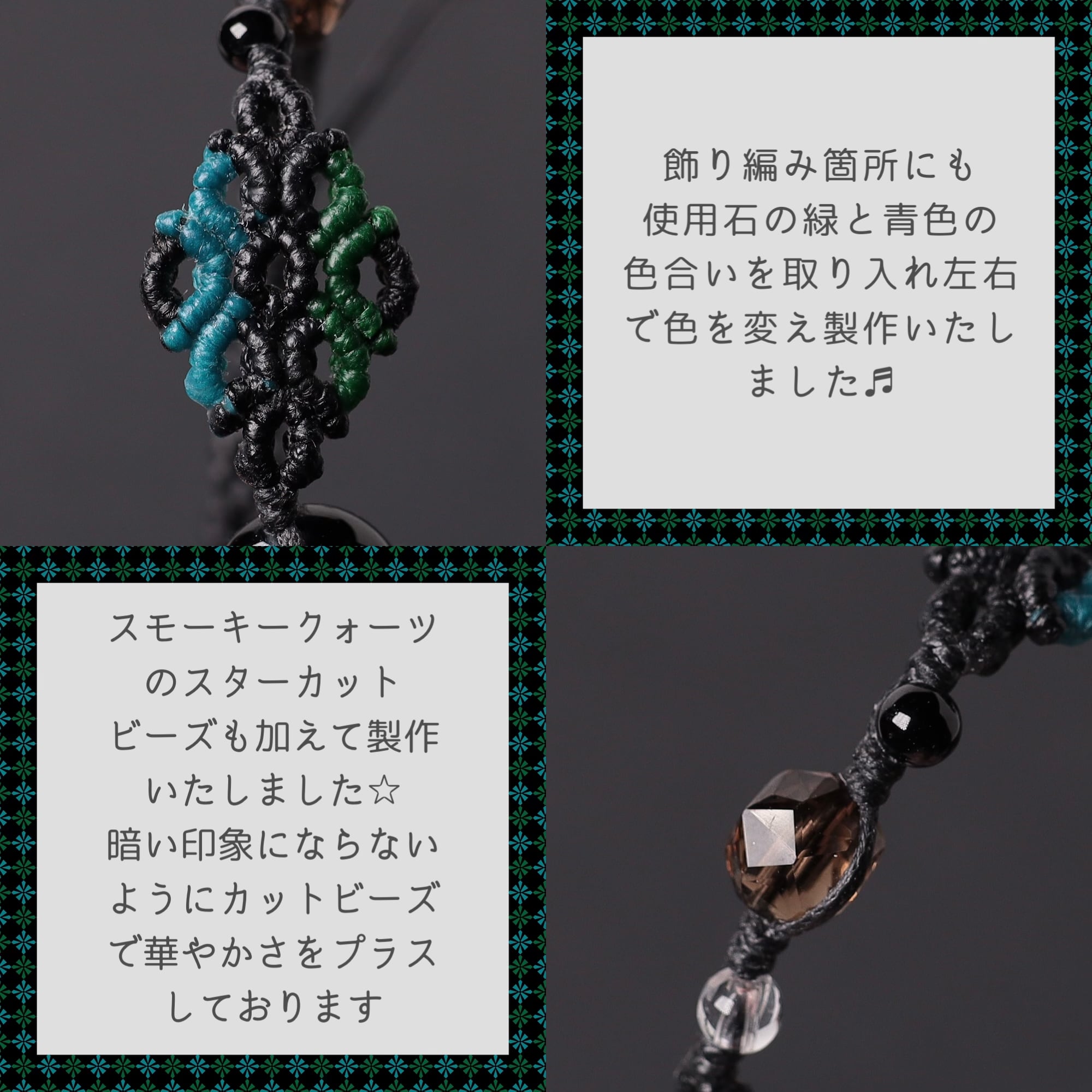 飾り編み部分も石の色に合わせて黒・ターコイズ・緑の色を加えました