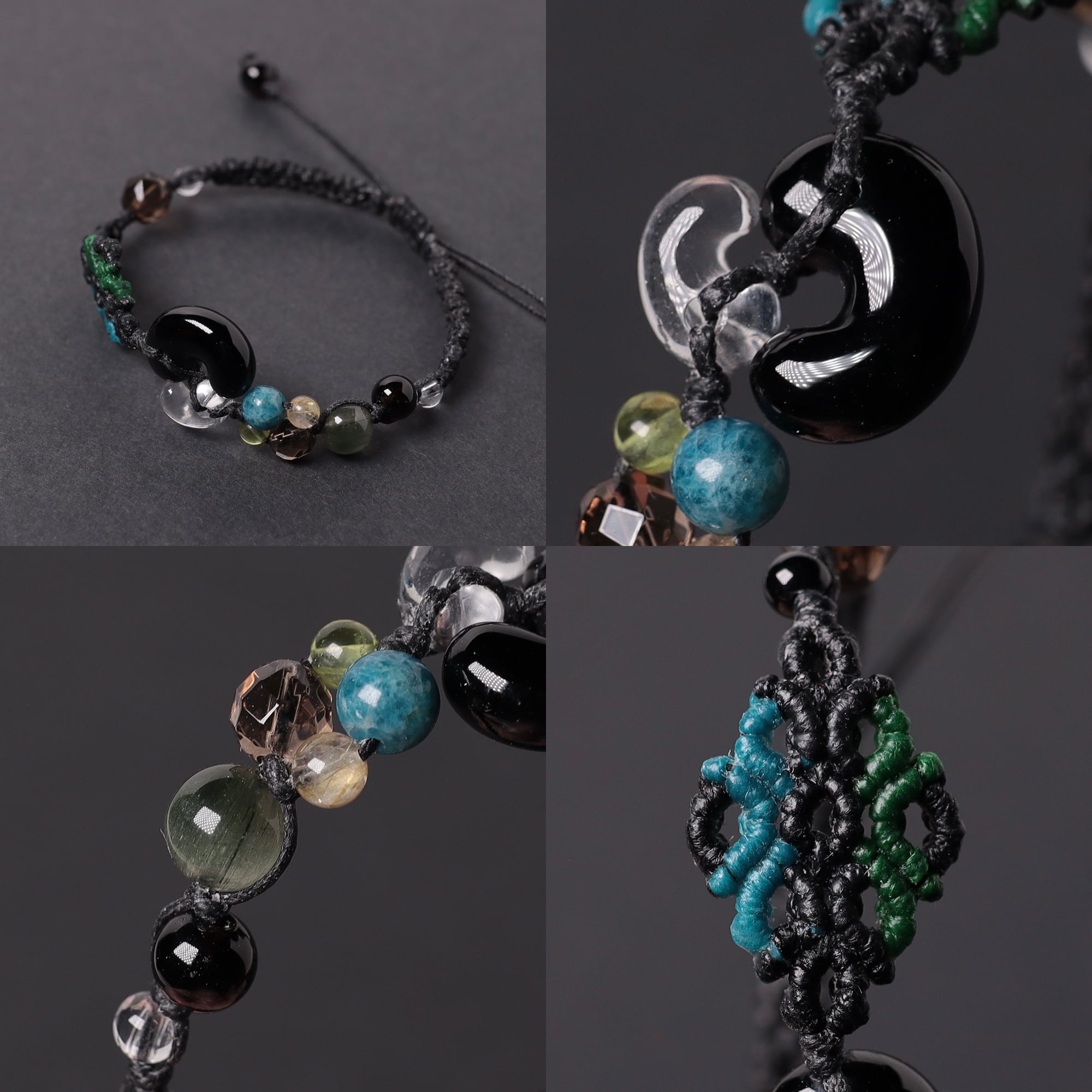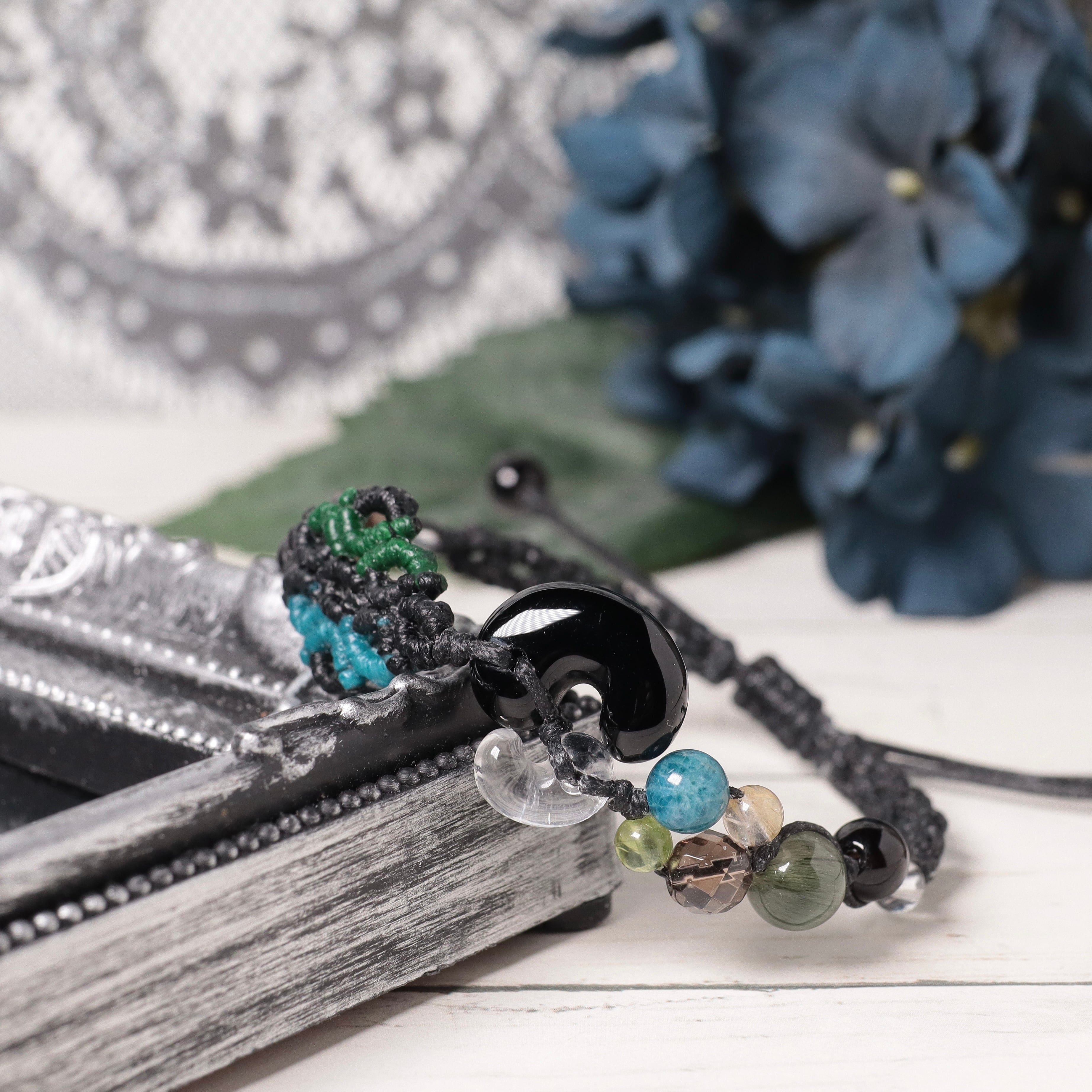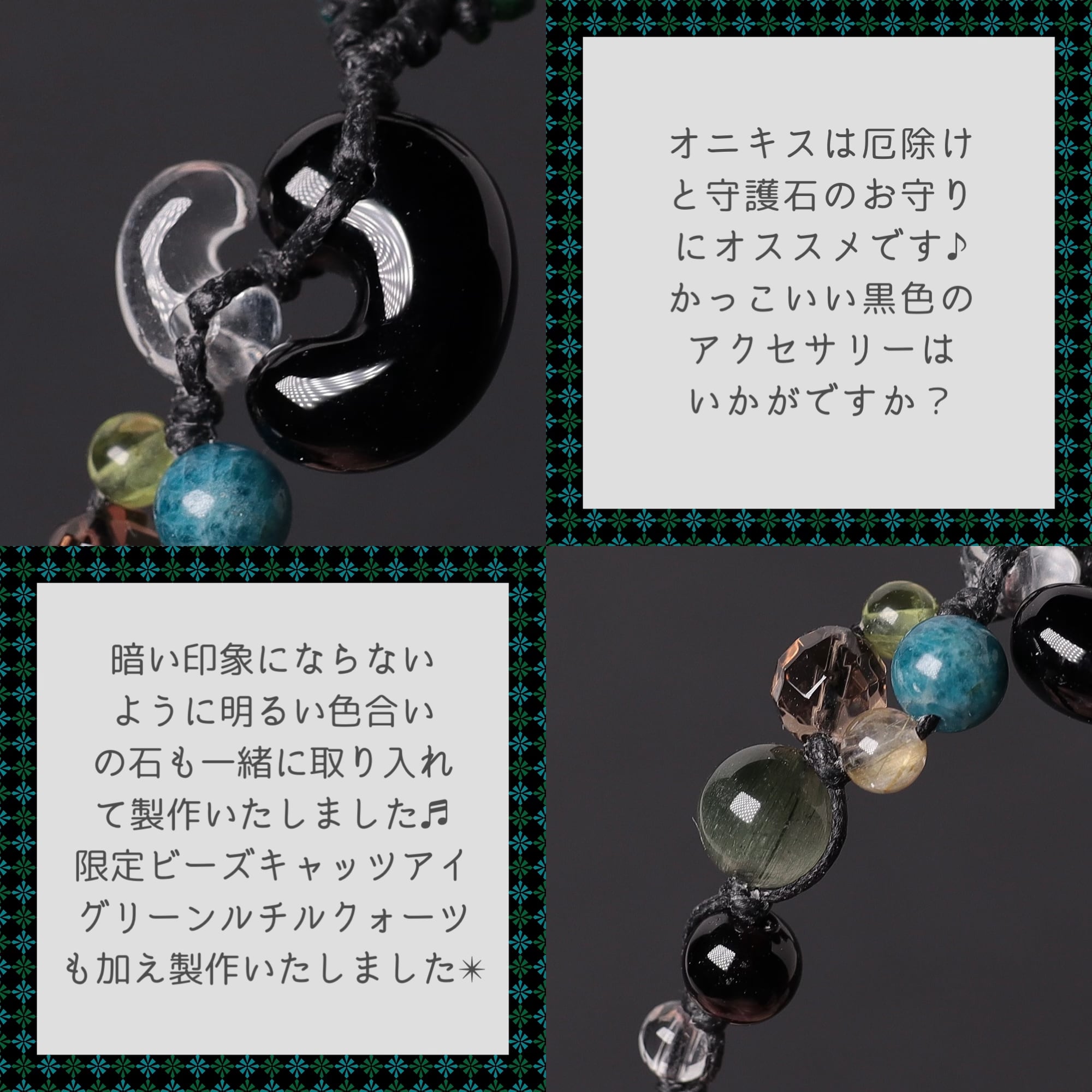 限定ビーズの天然黒水晶やキャッツアイグリーンルチルクォーツなども加え製作いたしました