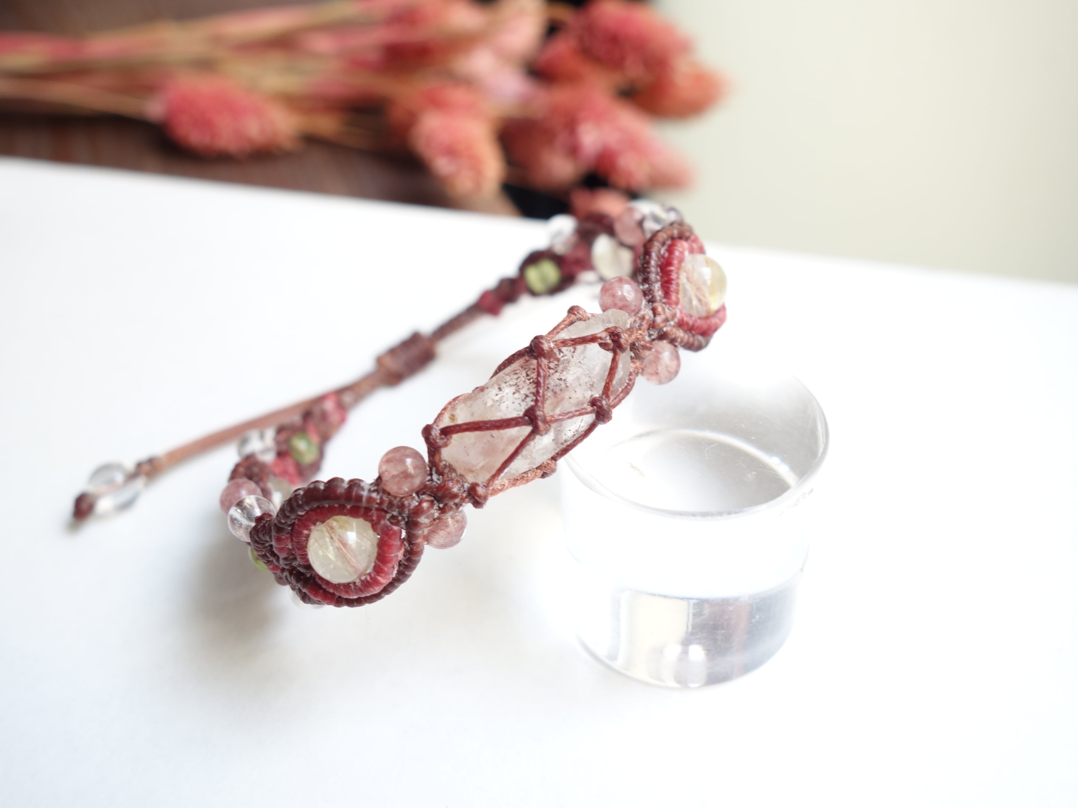 暖色のファントムクォーツに合わせて花の色合いの天然石で仕上げました。
